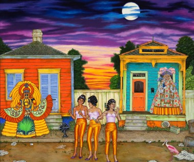 The small-scale figurative oil paintings of Douglas Bourgeois are enigmatic situations featuring one or two people in heightened landscapes or interiors. Some of the paintings are fictional portraits of unknown subjects looking at the viewer. Others are biographical fantasies, tributes to obscure recording artists. Inspirations are Deep Soul and Gospel music, primitive rock and roll, vernacular religious imagery, and discarded paper ephemera. The overwhelming natural landscape of South Louisiana, a beautiful vanishing Eden, is a primary influence. A connecting thread in the paintings and collages is the juxtaposition of the degraded and the sacred, light and darkness, the mundane and the transcendent.