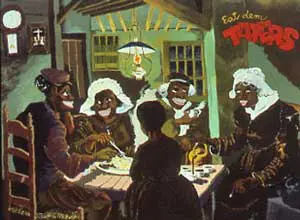 “These paintings are not directly about black people,” says the 63-year-old Colescott, running a hand pensively over his bushy white eyebrows. “They’re about a perception.” The poor-but-merry sharecroppers in Eat Dem Taters, he explains, are “a frontal attack on the myth of the happy darky. It’s a silly image exaggerated beyond even the stereotype to show that the myth was absurd. Van Gogh was saying that the peasants were eating their simple fare and glad they had it. But I think even he tried to show that they were brutalized by life. I just tried to push that idea as far as it would go.”