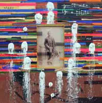 Bailey often uses broad, seemingly still-liquid strokes of indigo to define and accentuate a network of brighter colors and painterly gestures. Very often antique photographs of African-Americans — seated formal family shots, ancient baseball games, dignified individual portraits — are collaged into the lyrically grid-locked painting surface amid other fetishistic decoration such as African dolls and felt ribbons. The paintings are scarred and marked with dates, numbers, names of cities and places that allude to an historical undercurrent.