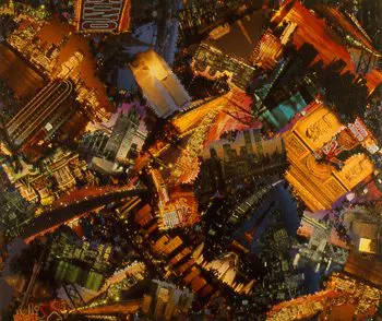 In Night Vision (2004), perhaps the most impressive piece here, Souza cobbles together sections from puzzles that give gleaming postcardlike glimpses at the skylines of Paris, Manhattan, London, San Francisco, Moscow, Las Vegas, and other cities. His fractured, frenzied, dense arrangement of images works as a metaphor for the parallels and interconnectedness of urban life in different cities.