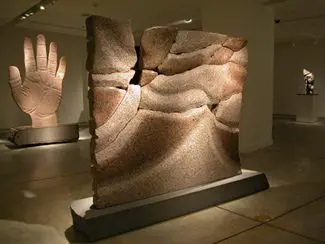 Moroles’ series of “Broken Earth” formations are nice to look at, but in this particular outing, it is his representational works that lead to the surreal and thus to a spiritual plateau that extends beyond illustration. The naturally pink “Mano de Jesus” is nearly nine feet tall and less than a half inch thick. Its flatness is its imprint, like a handprint in the desert, enlarged for species beyond to see. Of course, the multi-life-lined hand, smooth only on the nails, could also symbolize the connection of man with the earth.