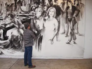 In fact, many of the characters appearing in Drake’s expose of the famous and not so famous, are dead. But that’s another story, which we will never quite know in his elaborately large charcoal on paper mounted on canvas drawings.