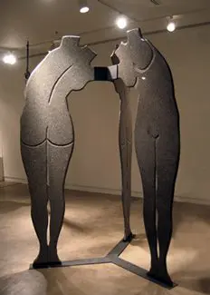 The three, headless ladies in Tres Mujeres, are a glossy black on fronts and a rough pale gray on backs and as flat as the “Mano de Jesus” but taller at nine and a half feet. They form a feminine triangle and evoke a Matisse de Milo.