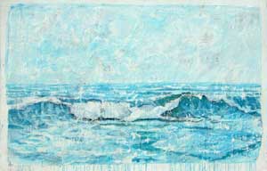 In Seascape # 2, light and air fill the picture plane, creating a snow-like quality in the layered blue and plaster washes, taking turns with transparencies and opacities. Pieces of paint lie in impressionist-like application, although inspired by value and tone rather than color. From a distance, the image weaves itself together, transcending the play on texture. The overall effect is one of elegance and grandeur.