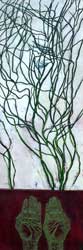 Displaced to Baton Rouge during the first uncertain days after the storm, Parker purchased cheap yarn the first she could find and began knitting, a craft she had neglected for decades. Although not consciously acknowledged, it was a symbolic act of weaving things together of making something from disembodied string an act of creating a new order. She soon began to literally put things in order in her mother’s damaged house, her own flooded house and the studio that she shares with her husband. Unable to work artistically during this period of restoration, it was not until she undertook a 2007 summer residency in Santa Fe almost two years after the storm that the literal work of ordering that she had been doing in the storm’s wake began to appear in her artwork as well. The Santa Fe residency was Parker’s first opportunity to gain distance and perspective post Katrina. The work that emerged is different from the earlier work in that it is less complex more straightforward, and. perhaps, more profound. Ritual and Double Plant are images from this later period. Painted in the difficult and tedious medium of encaustic, each utilizes the elements that Parker found comforting in the period immediately after the storm, linked together to create new meaning. Individual sprigs of clover knitted together to form a circular chain, dead blossoms, a thorny twig: each carries a new meaning as an element of Ritual. While the thorns may prick and there may be some casualties, re-invention restores life. Double Plant, created of encaustic and woodcut, imposes order over chaos: two panels represent an uprooted plant and a clover chain, arranged in a spiral. Like Robert Smithson’s mysteriously re-emerging Spiral Jetty, the two images suggest continuity, renewal and the persistence of life.