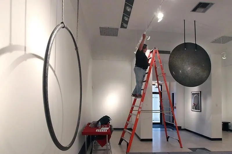 Rockport artist Jesus Moroles tweaks the lights for his exhibit at the Nave Museum. Moroles uses granite for his sculptures. (Photo by Frank Tilley)