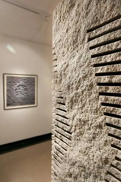 A tower of granite shows the contrast between the rough, unfinished surface and the sections cut with a diamond-tipped saw at the Nave Museum's exhibit of Jesus Moroles. (Photo by Frank Tilley)