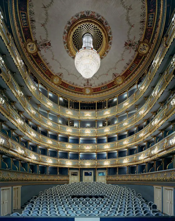 Shooting mostly with an 8×10 Arca-Swiss camera, Leventi takes each shot from the spot at center stage where a performer would stand. To light the images, Leventi uses only the existing chandeliers in the houses. “Though the proportion of the spaces varies, the goal is to attain both lateral and vertical symmetry in each image, thus flattening out the space in perfect equilibrium,” Leventi said about his process.