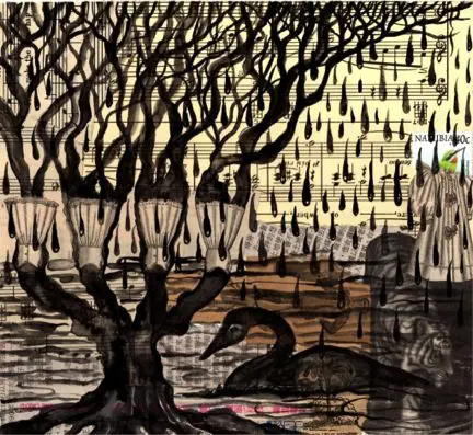 It’s all about the decay and the water that we are surrounded by. A lot of my paintings present a waterscape with things happening in it. I use the materials from the landscape—I collect Mississippi River water that I use in my watercolors, and water from the Gulf of Mexico, especially after the BP Oil Spill, with the Corexit in it. I fill bottles and date them, then mix it with the watercolors and use it over the news press collage. For the last 25 years I’ve collected garbage from these streets; I’ve started collecting baby shoes and painting landscapes on them.