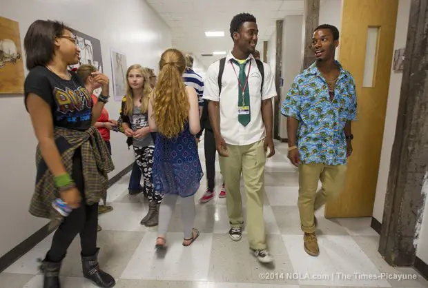 Leonard Galmon, back center, a NOCCA and Cohen College Prep senior who grew up around the C.J. Peete housing projects, will be going to Yale next year. He walks with his best friend DeRondice Reese at the end-of-year art show at NOCCA on Thursday, May 8, 2014. (Photo by Chris Granger, Nola.com | The Times-Picayune)