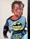 Leonard’s artwork is filled with his siblings. They sometimes fall asleep in his room. In one piece, a younger boy hunches over his Christmas scooter, scowling. His sister sleeps, sucking her thumb. His youngest sibling’s stuffed tiger sits on a chair. Timothy daydreams under a tree. Joseph walks away from a gun.