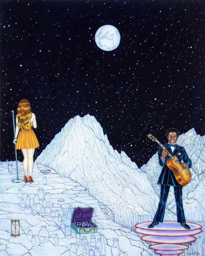 When Coco sings “Hey Love,” it sounds a lot like “halo,” which may be why Bourgeois chose to fill the sky above her with a glorious cloud of old-fashioned circular fluorescent light bulbs in pink, pale blue and white. He said he found the bulb image in the antique Sears catalog he calls his “visual bible.”