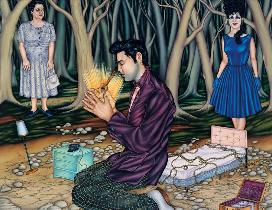 Douglas Bourgeois’s transcendent, fantastical images of pop icons as religious icons, set against southern Louisiana scenery, are inspired by his rural life and his homages to what and who inspires him. The lush, but flattened foliage of Henri Rousseau, the detailed, surrealist portraits of Frida Kahlo, one can’t help but find the clear artistic influences in Bourgeois’s work.