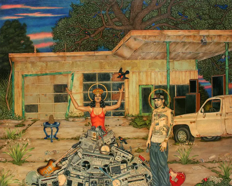 Even though there are many cross purposes and seemingly conflicted themes in my work, the paintings are my attempt to reconcile these “disparate” elements. To me, a heart-shattering soul song is as transcendent as a Giotto fresco or Dickinson or Blake poem.