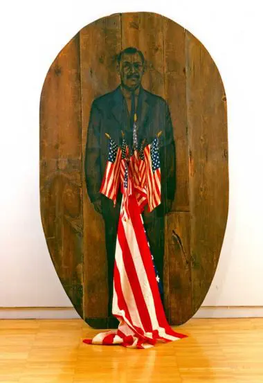 The large-scale wood assemblage You’re My Thrill features a charcoal rendering of a seated black soldier, posing with a gun. Surrounding him in a semi-circle are spent bombshell casings of various heights and origins. This work represents a theme of increasing importance to Lovell, who wonders why someone would have enlisted to serve a country that did not afford him basic human rights. This theme is visited again in America, which features a life-sized portrait of a man in a suit, standing straight with arms tight at his side. From his torso protrudes a large American flag of the era, flanked by smaller ones. The larger flag piles contentiously on the floor. Also of note is Deuce, a lithograph featuring a three-quarter profile of a man paired with his upside-down half profile, which was made at the Smith College of Art print workshop.