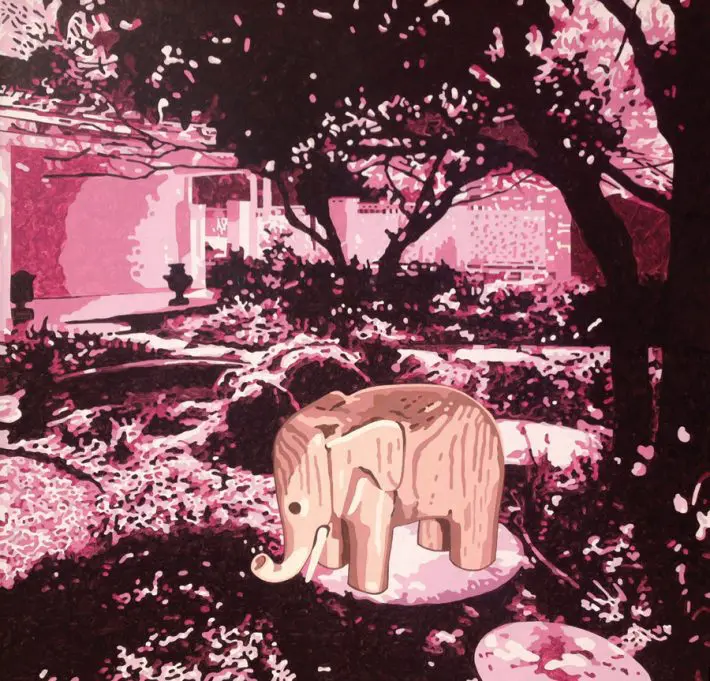 Pretty Boy (pictured), an elephant sculpture appears in a patio where the mauve light and pixilated composition suggest a fever dream from the remote regions of cyberspace, perhaps a Google search gone weirdly awry. In Art in the Garden, paintings seem to levitate at odd angles amid delirious blooms like a vision from an experiment in opiate vaping. Other works feature sculptural figures imbued with edgy human apprehensions, as if waiting to make a run for it. By invoking the quicksilver digital evanescence of the present, Richard reunites painting with its origins in the Stone Age, when flickering fires seemed to animate the spirits of creatures depicted on the cavern walls.