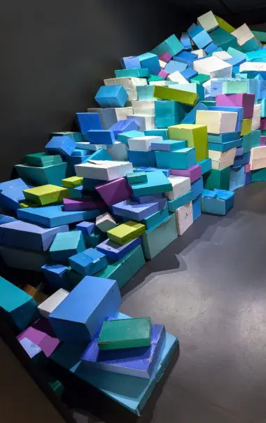 But, let us begin our Walk on Julia Street with a married pair of local artists, Jenny LeBlanc and Kyle Bravo. Founding members of The Front Gallery, LeBlanc and Bravo’s New Wave installation snugly fills Arthur Roger Gallery’s New Media room. Dadaist in nature, New Wave monopolizes the small space with colorfully painted cardboard boxes piled high and deep. Included in the mix is a repetitive sound of movement, though only one or two boxes actually move. The gallery’s Press Release asserts that New Wave “explores the ordinariness of everyday life alongside an existential search for meaning and purpose.” Like computer chips continually storing and processing, the modular New Wave beckons us to ponder all the stuff we accumulate one day, and so quickly toss come morning pick-up.