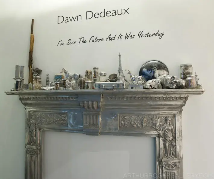 Dawn DeDeaux: The Mantle. 2016-17. Aluminum mantle with orbs and objects. 60 x 72 inches high.