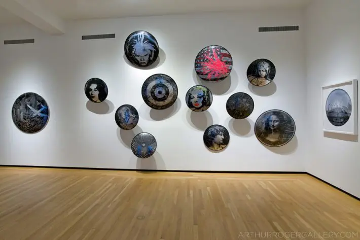 To the rear of the gallery, a similar installation of wall-mounted “shields” depict Pop icon Andy Warhol and the celebrities he celebrated in his work, such as Elizabeth Taylor, Marilyn Monroe, and the Mona Lisa. Warhol’s repetition of their portraits was a metaphor for the way repetition in general depletes the original content of the image, as well as democratizes it, taking away a layer of celebrity at the same time as sympathizing with the deconstruction of original self that celebrity incurs. While a public might feel nostalgic, or idolatrous, about these individuals, Warhol’s work insists that those feelings are immaterial and shallow. DeDeaux’s choice of these images also suggests the superficial feelings that humankind associates with power, and particularly in the case of Monroe, how fleeting that power can be. The inclusion of Jasper Johns’ target and a spattered U.S. flag mixed in with the crowd appear to emphasize the concept.