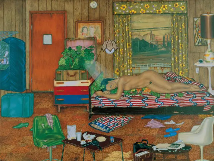 I guess I call them everypersons. They stand in for all these anonymous people. It’s like you’re telling a story and these characters are the lead, the main characters of a short story. There’s one called The Traveler. She’s a traveling salesperson or whatever in this horrible hotel room. That’s where you really get to build a story with all these little details. I almost think sometimes I put too much stuff in them. There’s something they call horror vacui, which means fear of empty space. Her calculator, her briefcase, her hair dryer and her fast food. She’s perfectly nude with leaves under the bed, and she’s opened her suitcase and this little tiny forest with these rays coming off it heal her. Outside is a chemical plant, which I got from driving along a river. How many rec rooms have you been in with this paneling? The orange door… it’s just part of the part of the costume. One time somebody asked me why do you put current groceries and things in the painting? It’s so you don’t think it’s a painting from long ago. It’s to place it in time like a photographer does. It’s hazy, time indeterminate, but within a range of time that is late American consumer culture.