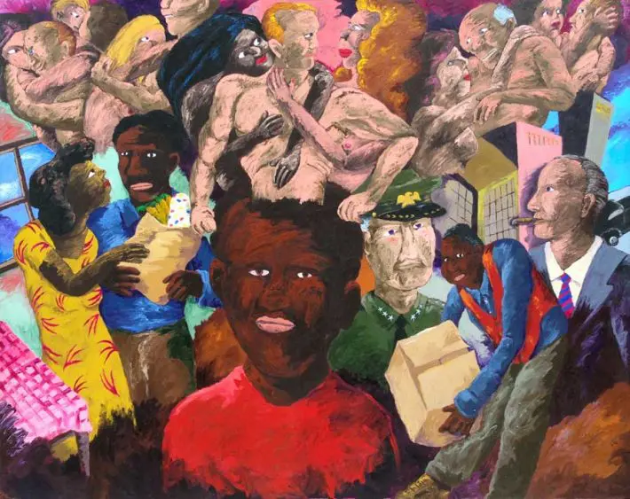 Robert Colescott, Power for Desire-Desire for Power, 1987, Acrylic on canvas, 90 x 114 in., Promised Gift of Arthur Roger, EL.2016.132.16, © Robert Colescott.