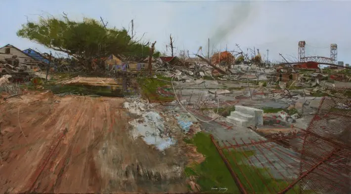 Second note on “Pride of Place,” which will remain on display until September 3: It’s best thought of as a mixtape. The one voice that runs through the show is Roger’s, and you can see how 90-plus percent of the works in the show could live in the same collection. There are features—George Dureau’s photos make a few appearances, as do pieces by John Waters—and the whole is livelier than its concept. Some pieces feel like New Orleans’ greatest art hits—Gene Koss and Lin Emery sculptures, for instance—but there’s also a small, surprisingly provocative neon Star of David sign by Keith Sonnier hung on the wall. The Gordy headshot is unusual in its roundness, and my daughter thought it looked like the black and white photo of Andy Warhol by Greg Gorman next to it minus Andy’s ‘80s spiky-haired wig. On one wall, Simon Gunning’s “The Red Barge and the Yellow House” gives us Hurricane Katrina’s destruction as devastation. On another, Michael Wilmon’s “The Great Katrina Flood, 2006-7” presents post-K New Orleans as dark comedy enacted by Dia de los Muertos skeletons, and it’s not clear which is more powerful.