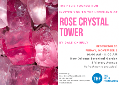 unveiled in the plaza in front of the New Orleans Botanical Garden in New Orleans City Park. The installation of Chihuly’s Rose Crystal Tower in New Orleans City Park was underwritten by The Helis Foundation and it will stay at this location for two years, through November 2020. The sculpture was most recently on view in New York City’s Union Square Park.