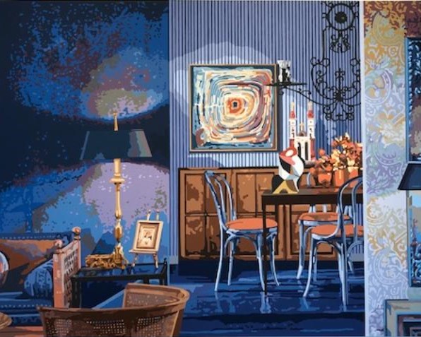 According to Plato’s theory of art, the representation of a chair cannot be sat on, therefore art is not useful. This is a cartoonish interpretation of his argument but why paint a chair? or everyday objects? For Richard, they represent a presence (or absence) and a story, which can be hellish like in Modern Inferno, 2019, featuring a decor fit for Huis Clos, (No Exit), the famous play from Jean-Paul Sartre.