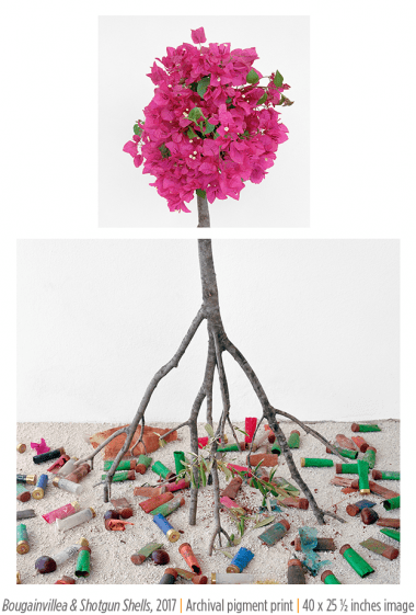 On the opposite wall of the gallery is a group of photographs that were captured over 10 years in Greece. The vivid colors and Mykonos are well represented in the multi-part photographs. Halliday has been known to combine multiple photographs to create a piece but the artist evolves the process in Quotidian Life. The artist combines two photographs and two frames to create a 3-dimensional composition. He juxtaposes a cluster of bougainvillea atop impossibly small tree branches that seem to serve as spindly legs dancing among spent shotgun shells. Halliday, a chef in a previous incarnation, artfully arranges a group of fish atop a vivid blue table creating movement and beauty with the fresh catch.