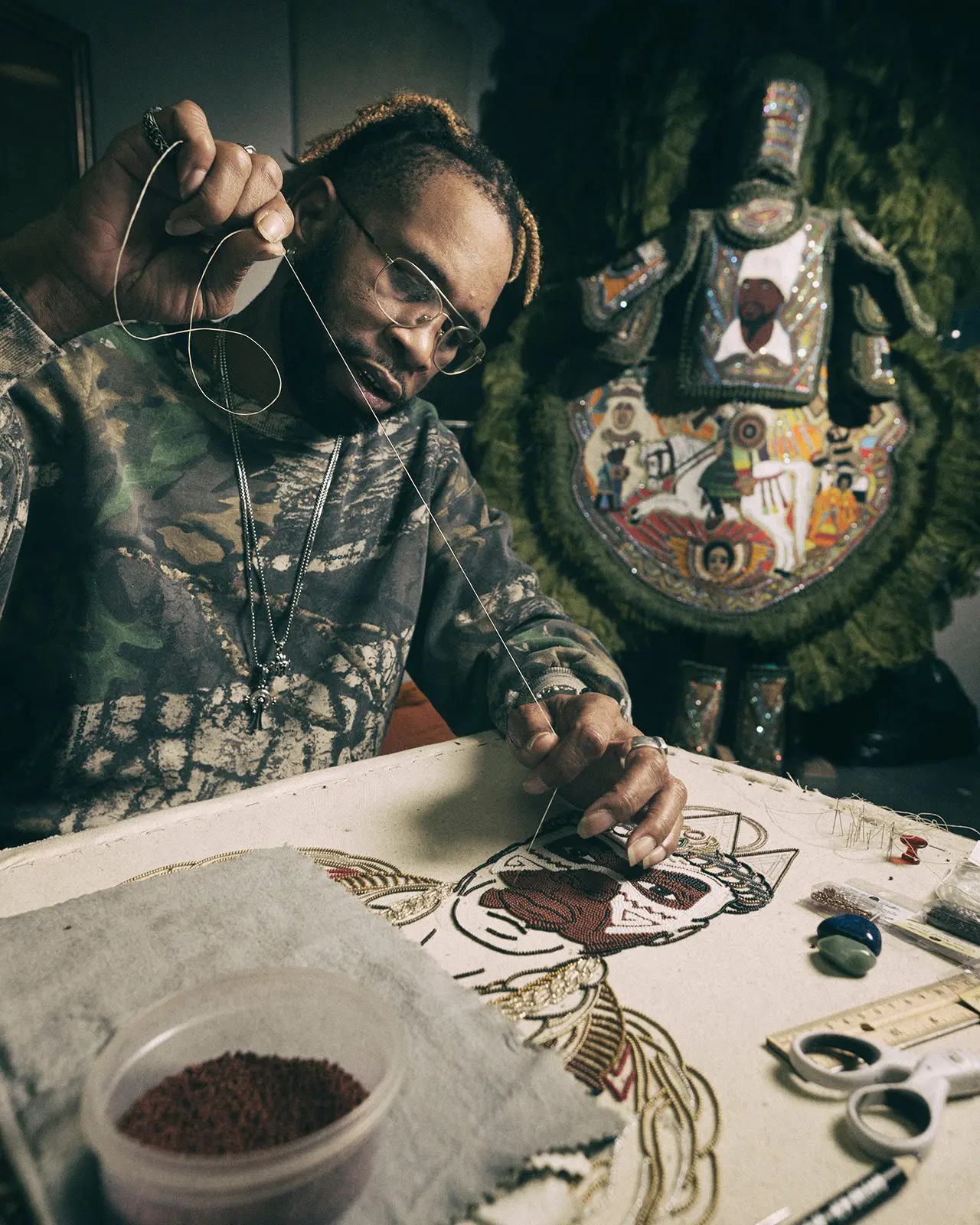 Demond Melancon (b. 1978) works solely with a needle and thread to sew glass beads onto canvas. He began this form of art in 1992 when he first became part of a 200+ year old culture known as the Black Masking Culture of New Orleans. Today as a Big Chief, Melancon is well known for creating massive suits which he wears as a Black Masker in ceremonial battles on Mardi Gras day. The suits he creates are sculptural forms based on the size of his body and are composed of intricately beaded patches revealing a collective visual narrative.