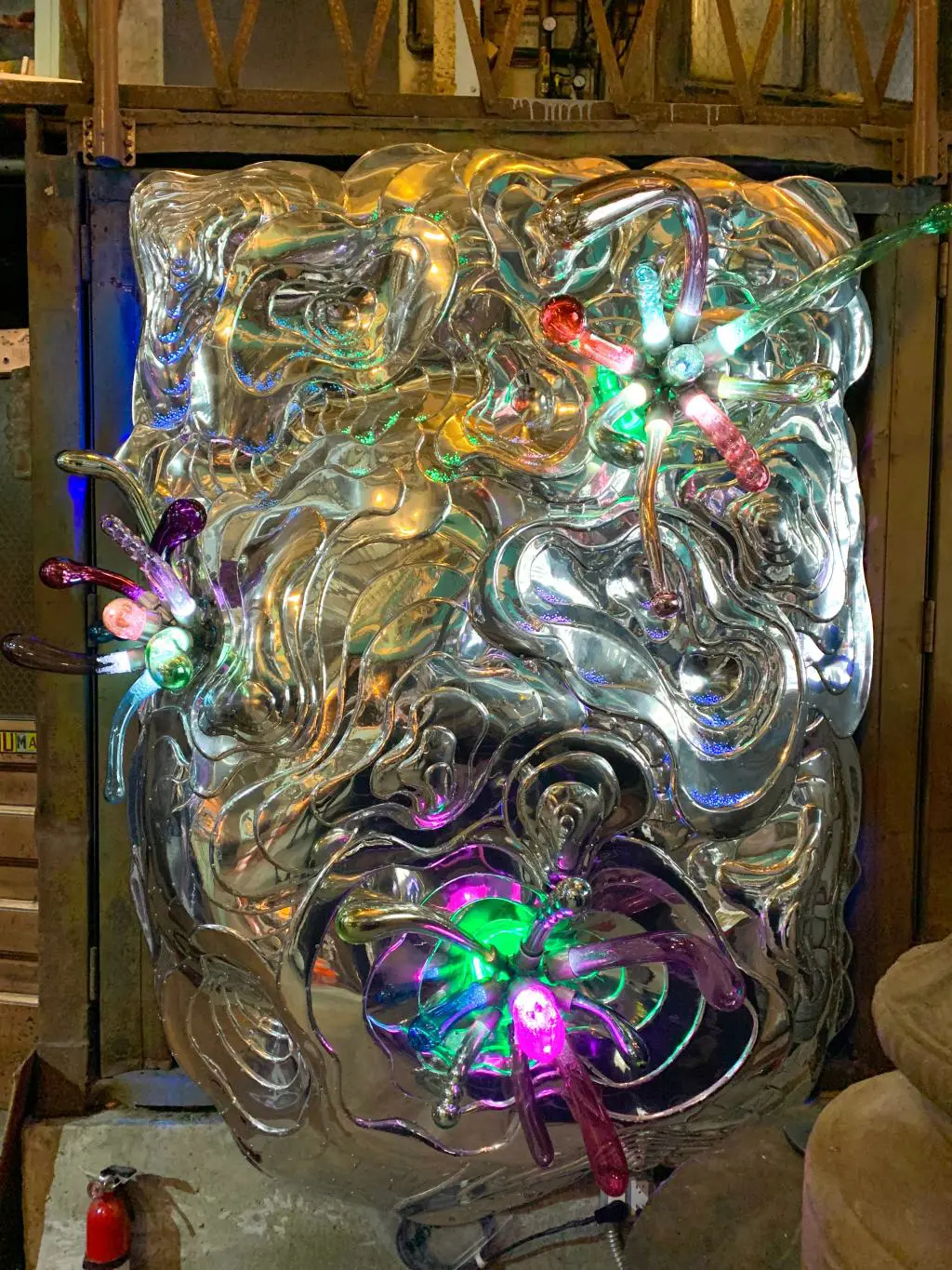 Cast glass, hand silvered mirror, LED electronics, and hand rolled & hammered polished aluminum