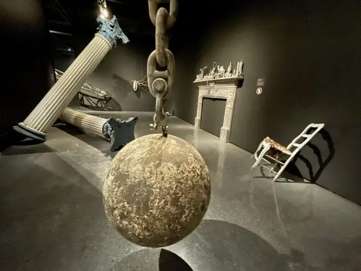 And the ominous wrecking ball, which hangs like a chandelier from one of those antique ceiling medallions you see in New Orleans mansions, symbolizes a whole range of self-destructive, existential menaces that have dominated DeDeaux’s thinking for decades.