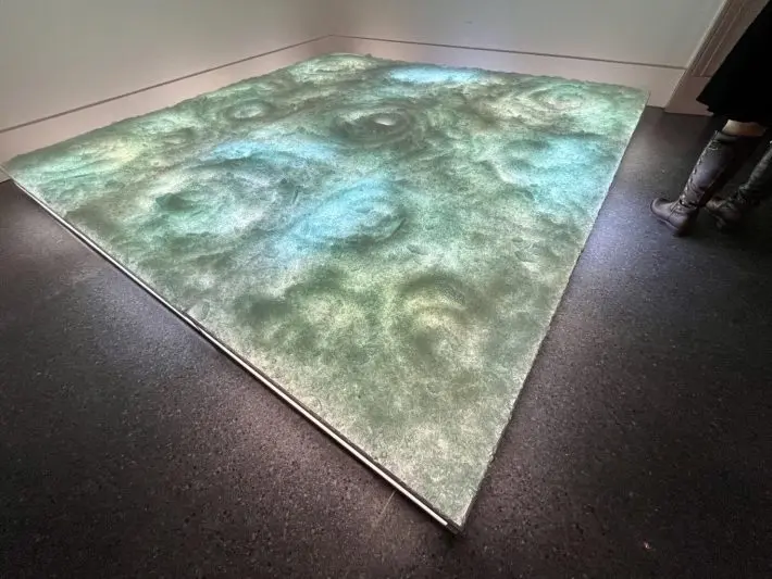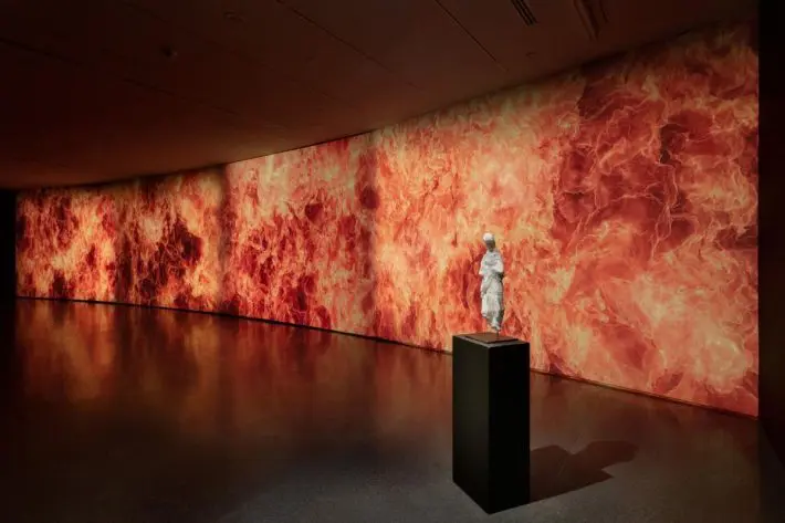 The glittering three-ton heap of blue-green, broken windshields, which DeDeaux arranged into the swirling shape of hurricanes, symbolizes nature’s shattering power. The water-eroded marble statue of Mary is a sign of how whole civilizations can eventually wash away. The giant mummy, which has the texture of a molten asteroid, reminds us that at any moment we could be wiped out like the dinosaurs.