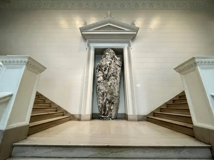 Her retrospective exhibit titled “The Space Between Worlds” at the New Orleans Museum of Art is a collection of objects that, under other circumstances, you probably wouldn’t consider works of art. There are thirty wooden bowls filled with dirt, an array of charred two-by-fours, three tons of shattered automotive glass, a ruined marble statue of the Virgin Mary, a crusty, 11-foot-tall aluminum mummy, and an enormous wrecking ball hanging on a gigantic chain.