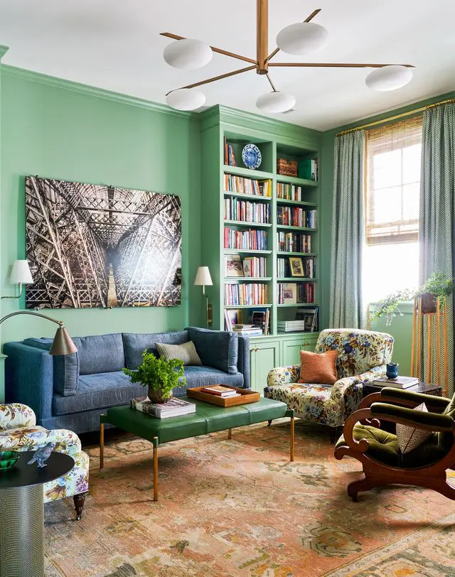 With an apartment of such scale—the ceilings are 12 feet high and the ample rooms have a traditional square format—it took cunning to ensure that the furnishings were not dwarfed. In a loft, for example, decorators might resort to installing massive sectionals and vast refectory-size slab dining tables, but that is neither the Isaac-sons’ nor New Orleans’s style; the project required finesse. The couple had quite a few good 19th-century antiques from their previous apartment. Brockschmidt and Coleman brought in such new acquisitions as an early-18th-century oak sideboard and an English Victorian club chair. They also added several contemporary light fixtures, including two huge, cagelike lanterns that dangle above a green slipper chair and a settee in a sand linen.
