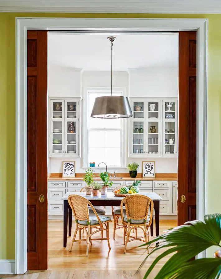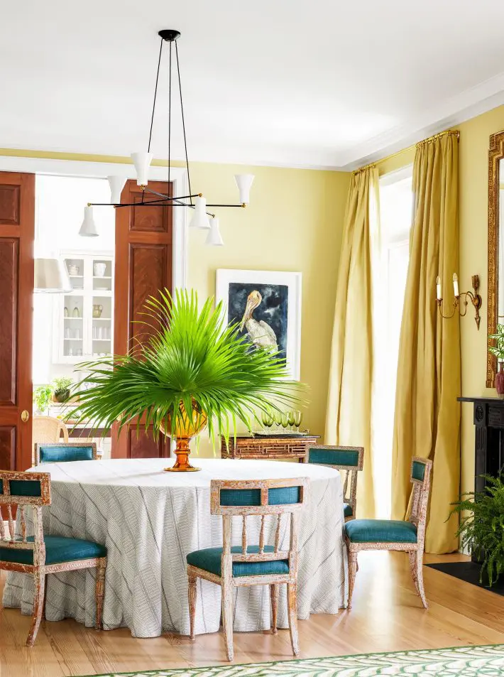 The Mardi Gras palette of emerald, purple, and gold may be ubiquitous in New Orleans, but the hues of the Isaacsons’ home are pale and serene. Cathy wanted a yellow dining room, so the designers used a misty shade to set off the Gustavian dining chairs upholstered in teal Belgian linen. The library has greenish-gray walls, with a digital image printed on metal by the New Orleans multimedia artist Dawn DeDeaux above a blue velvet sofa. On many afternoons, the Isaacsons each grab a volume from the shelves and wander out to the porch for a quiet hour before the evening’s guests arrive. “I love to listen to the clattering and ringing of the streetcar,” says Isaacson. “It’s the soundtrack of my happiest times.”