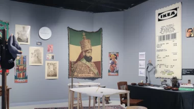 The artist and his wife and co-creator, Alicia Melancon, spend long hours in the studio, fabricating images of people and events that can’t be forgotten. Their workroom, recreated in the exhibit, is decorated with figures who inspire Melancon: portraits of victims who activated Black Lives Matter protests; a tapestry of Ethiopian Emperor Haile Selasse I, who sought to modernize his country in a 44-year reign; and a rug replicating an IKEA receipt by designer Virgil Abloh (1980-2021), whose meteoric career was cut short by cancer.