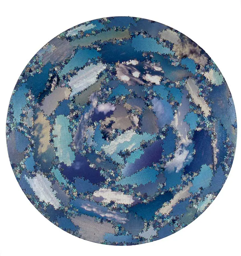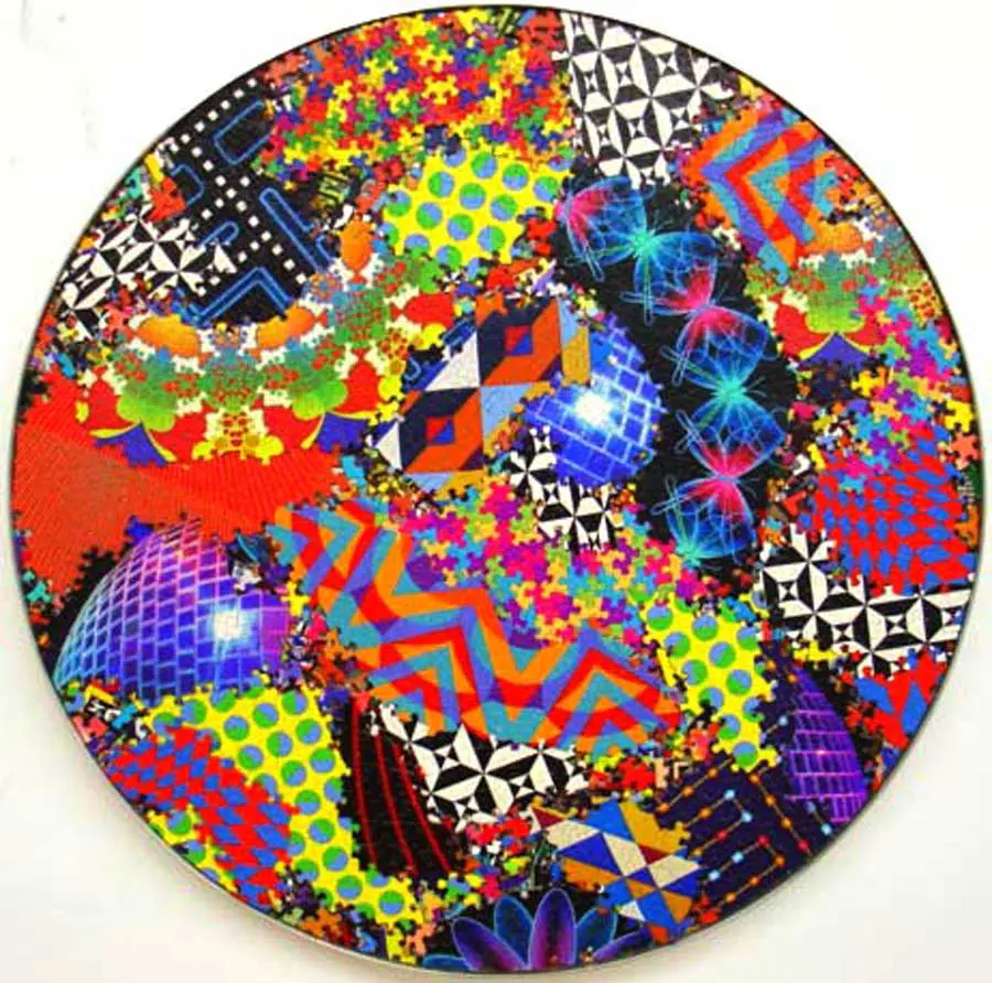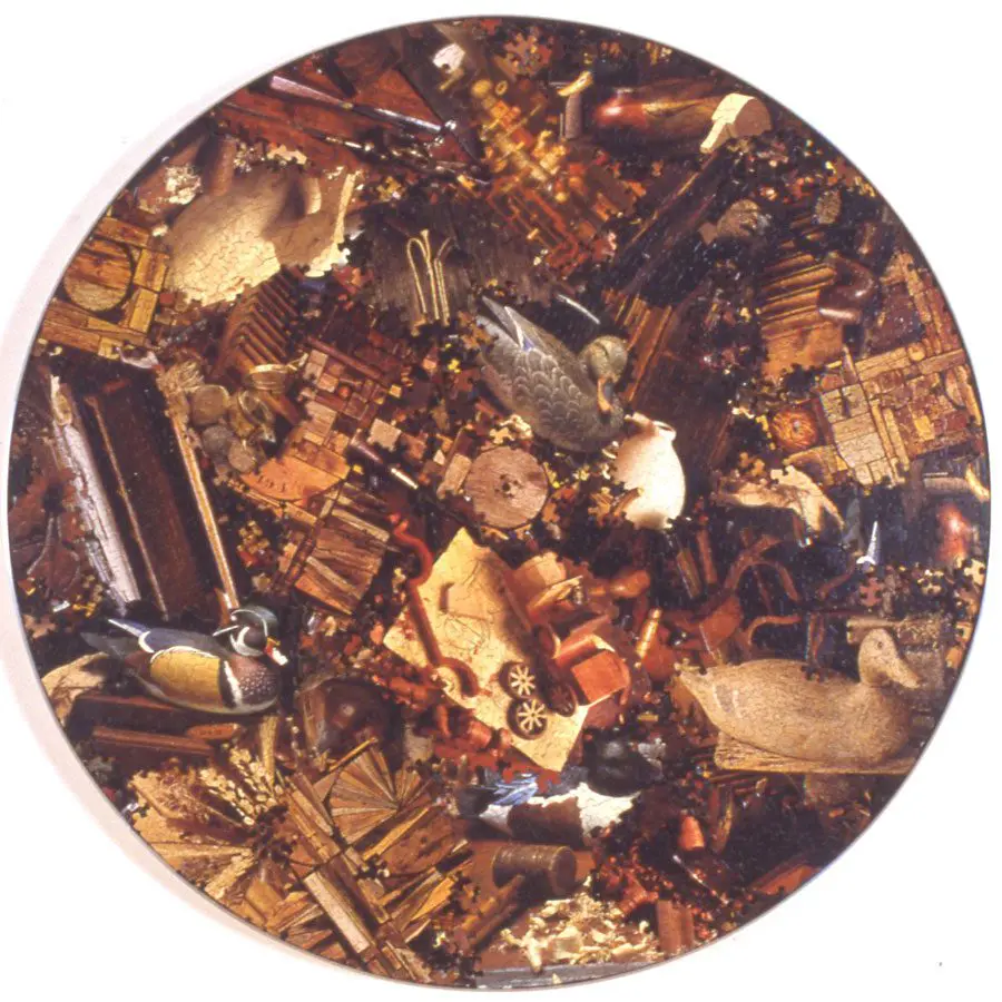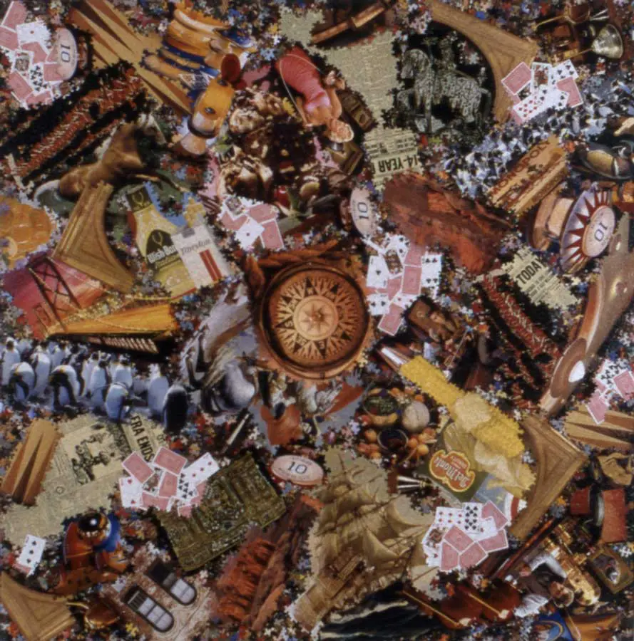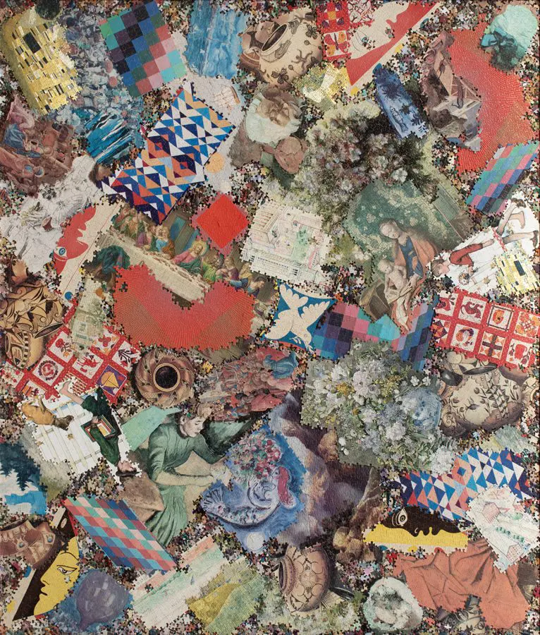 Through his artwork, Al Souza investigates the aesthetic and conceptual properties of die-cut jigsaw puzzles, removing individual images from an original whole and arranging them onto the surfaces as he sees fit. His assemblages are filled with seductive juxtapositions recombining ideas and images. They resonate with energy while achieving subtleties of both color and space. Souza refers to his assemblages, composed of thousands of collaged jigsaw puzzle pieces, as “paintings.” Souza says, “I look at them structurally the same way a painter would.I usually have fragments of puzzle spread around on my studio floor, and then I get up on a ladder and make decisions. The whole room becomes my palette.” The resulting assemblages work in the same way that a painting does. Up close the works are filled with intense detail, but from afar each work creates a rich tapestry of color and texture in coherent compositions.