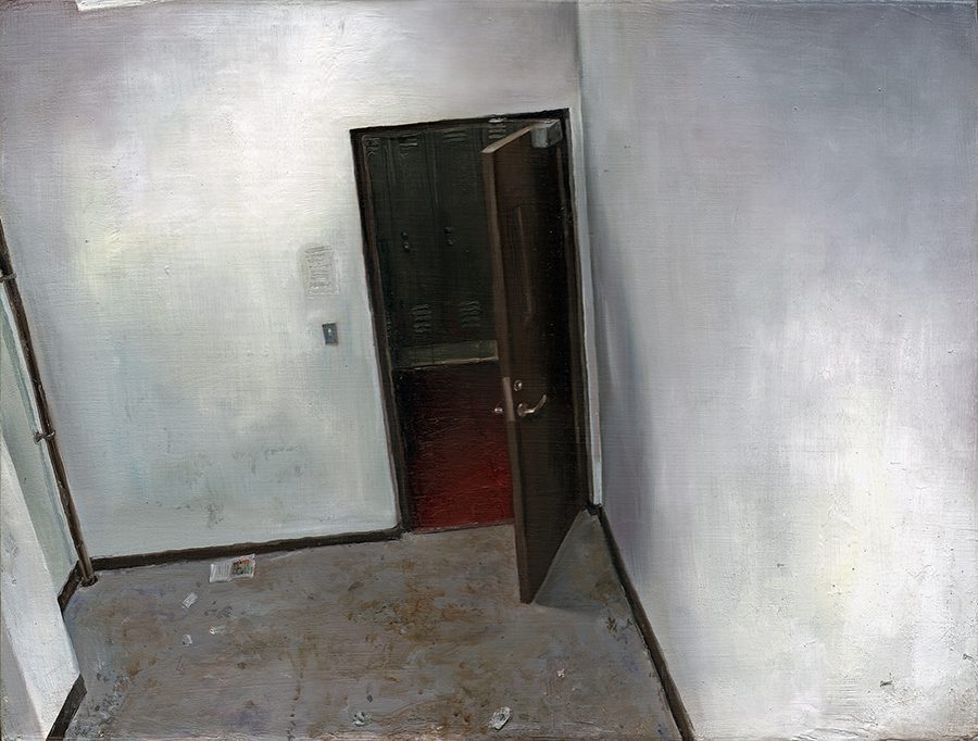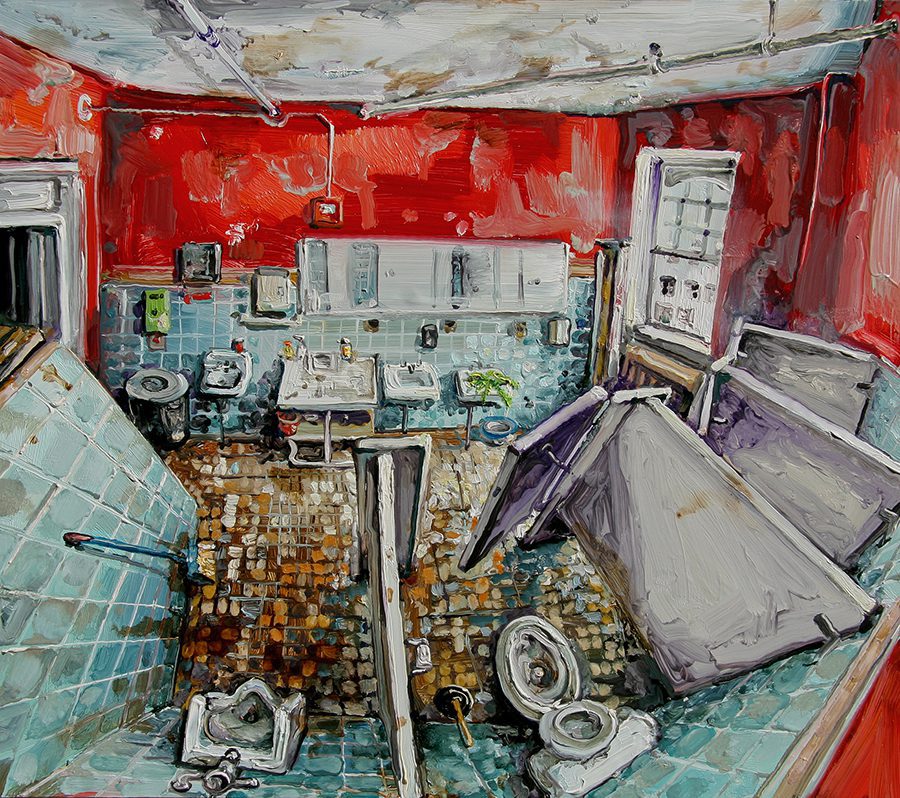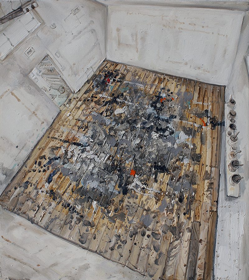 The paintings of Amer Kobaslija encompass detailed representations of artists’ studios as well as cityscapes often fraught with disaster. Regardless of the subject, the perspective is much the same, described as a, “moth’s point of view” or as “standing on a hillside looking down,” giving the viewer a broader but more immediate experience of the subject.