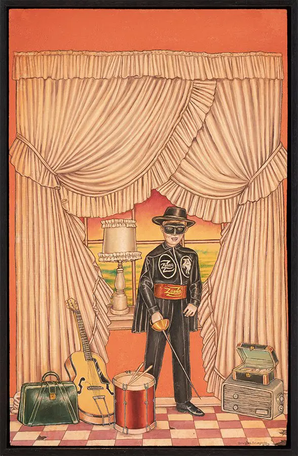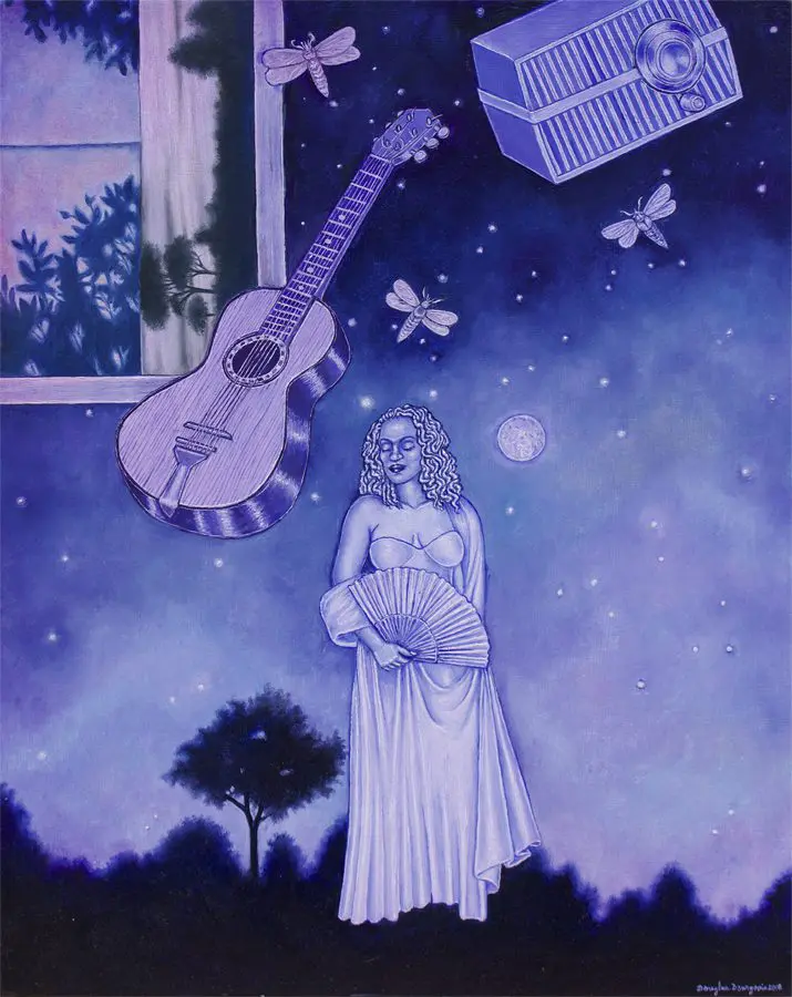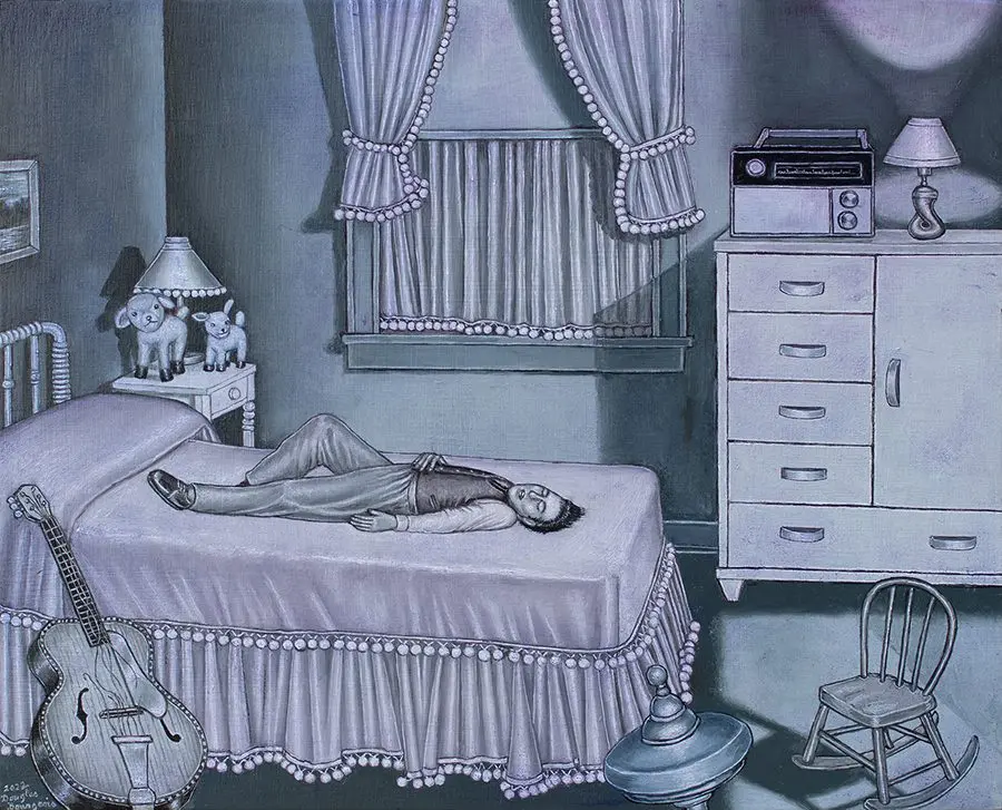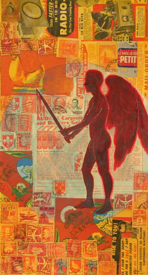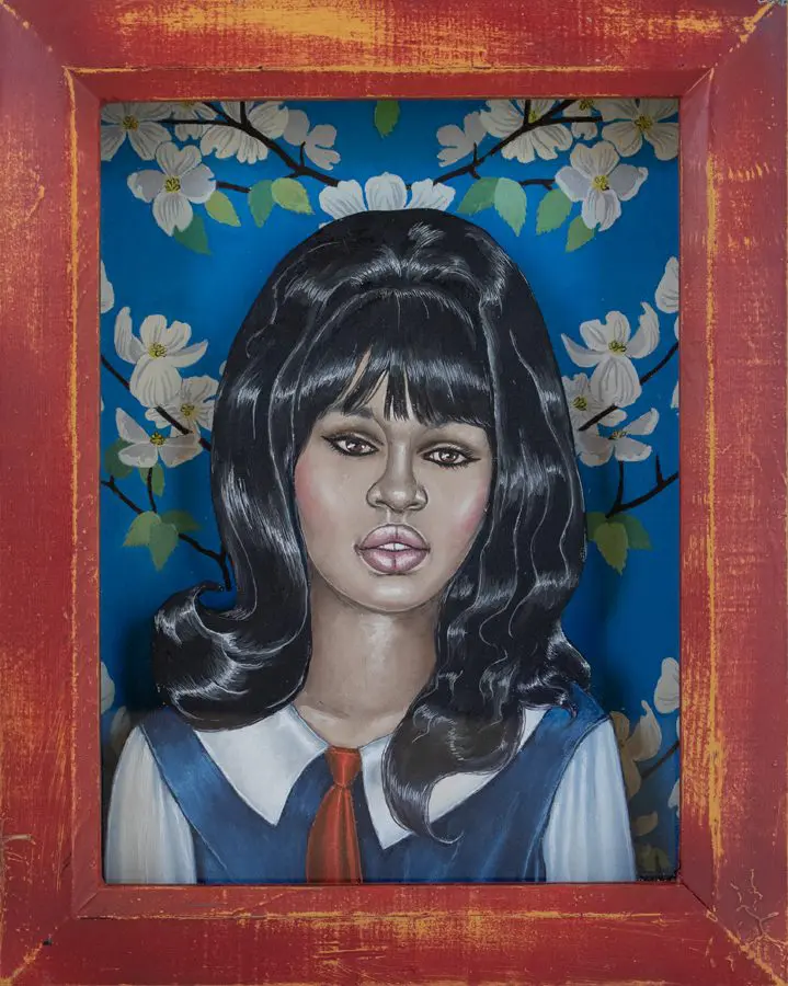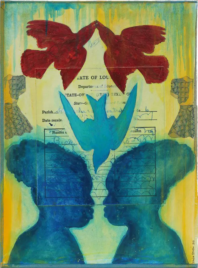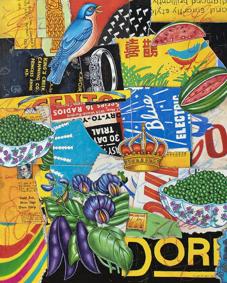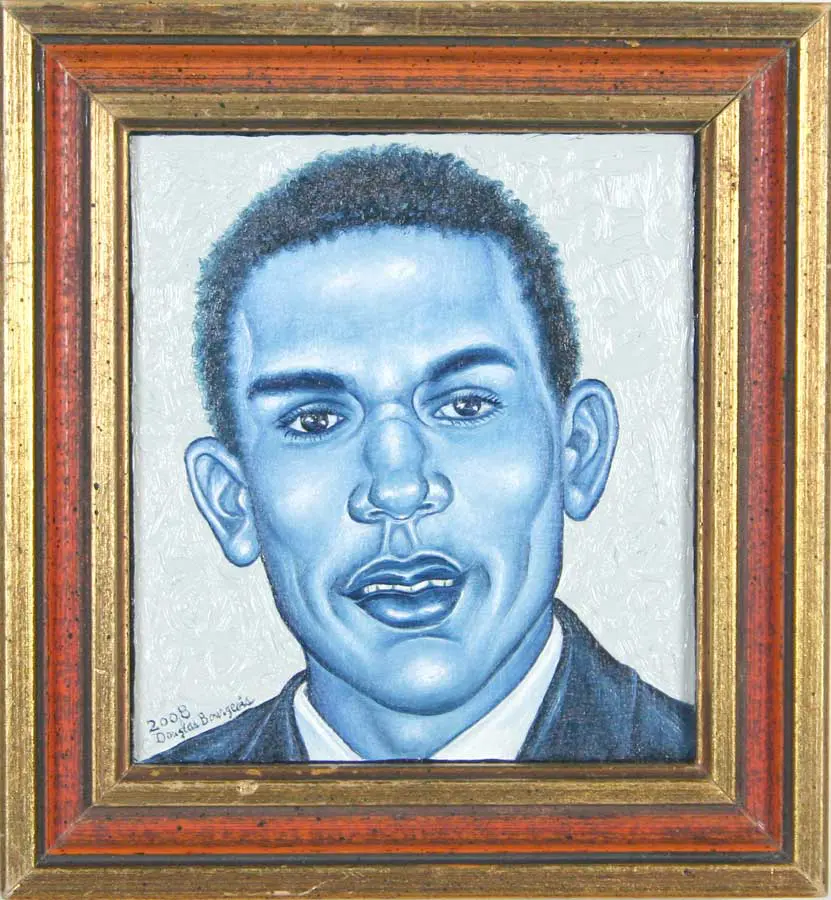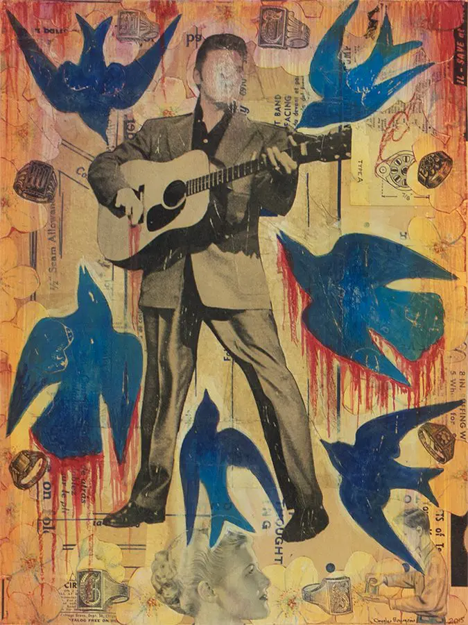 The small-scale figurative oil paintings of Douglas Bourgeois are enigmatic situations featuring one or two people in heightened landscapes or interiors. Some of the paintings are fictional portraits of unknown subjects looking at the viewer. Others are biographical fantasies, tributes to obscure recording artists. Inspirations are Deep Soul and Gospel music, primitive rock and roll, vernacular religious imagery, and discarded paper ephemera. The overwhelming natural landscape of South Louisiana, a beautiful vanishing Eden, is a primary influence. A connecting thread in the paintings and collages is the juxtaposition of the degraded and the sacred, light and darkness, the mundane and the transcendent.