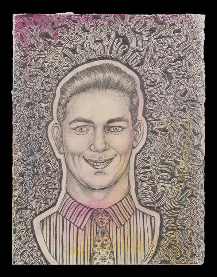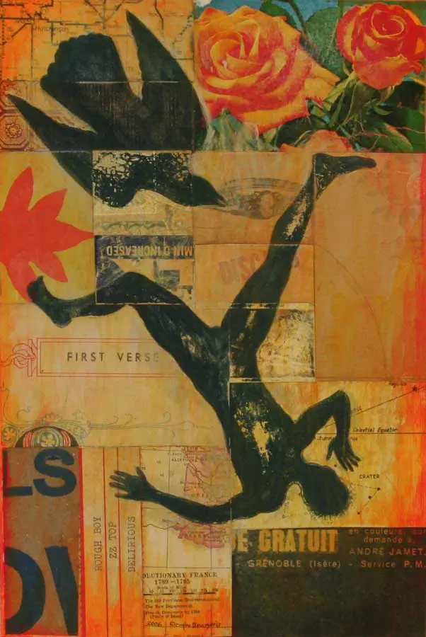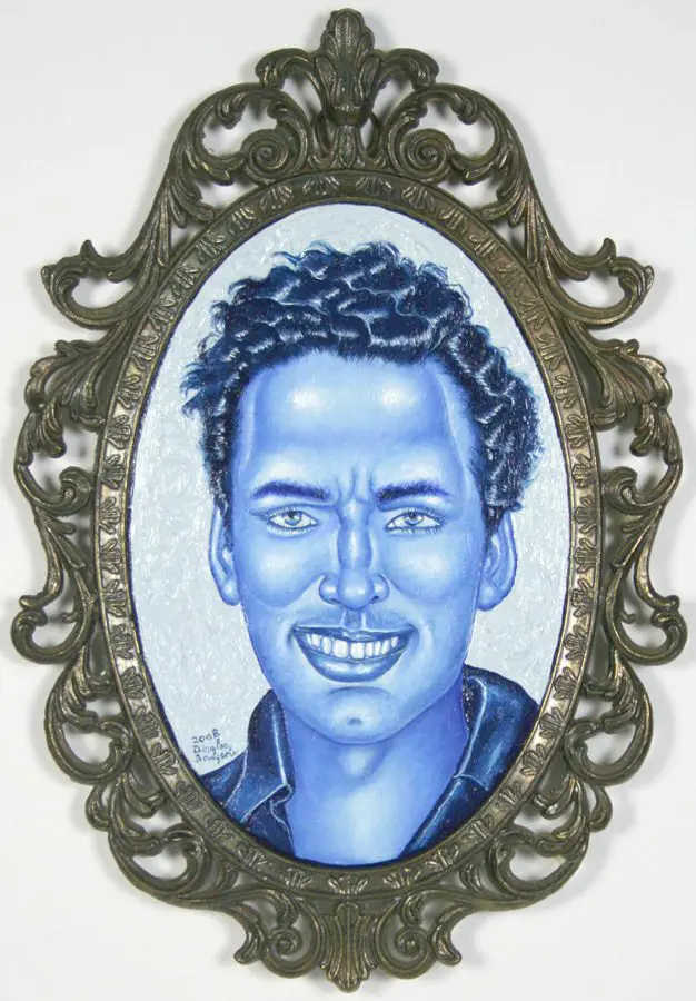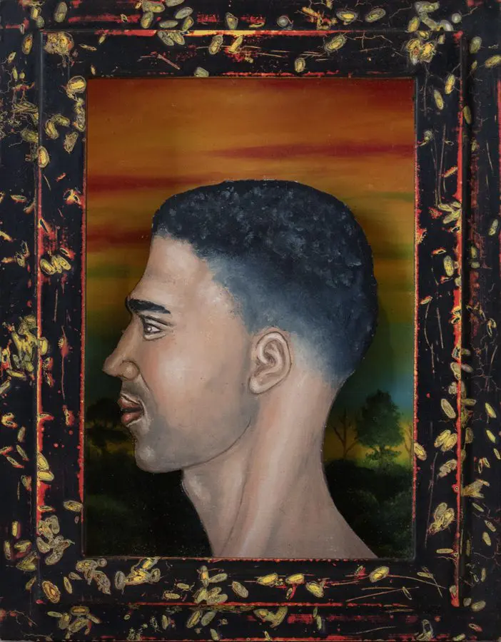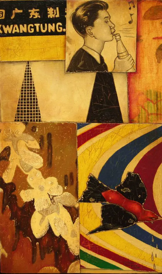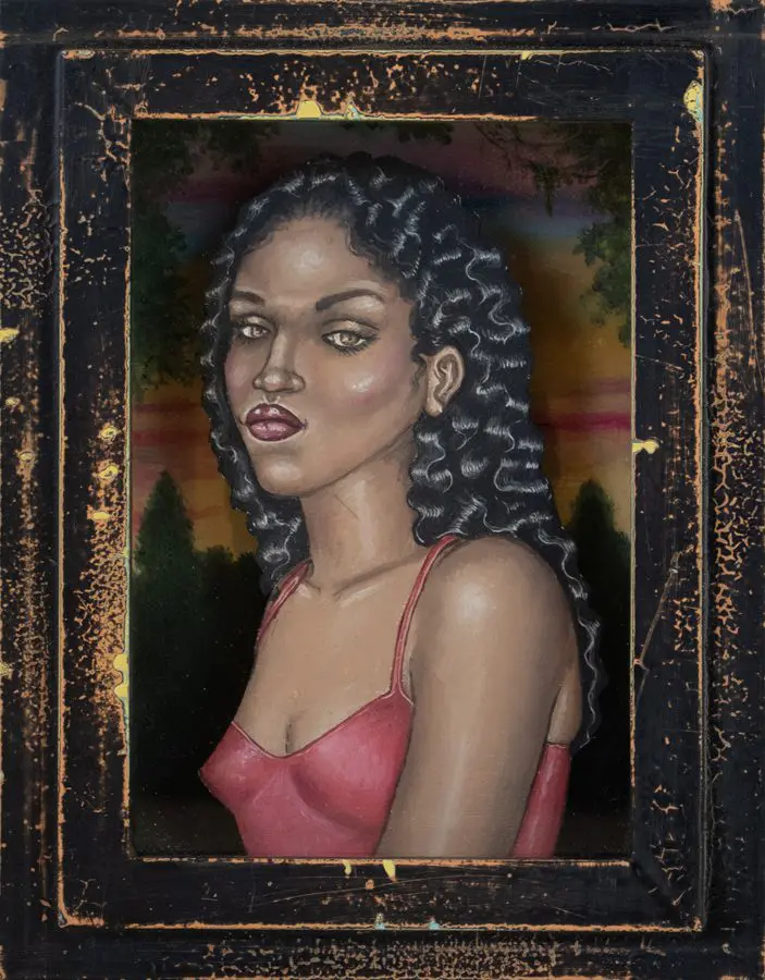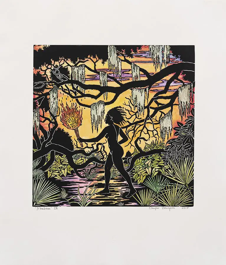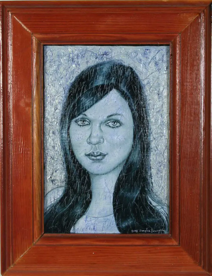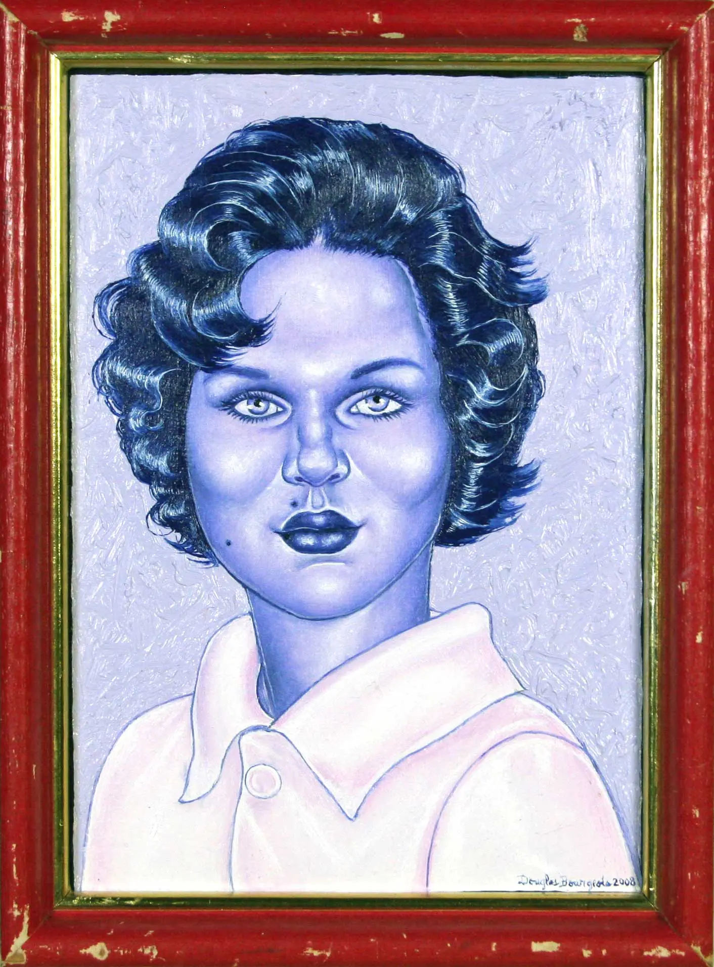 The small-scale figurative oil paintings of Douglas Bourgeois are enigmatic situations featuring one or two people in heightened landscapes or interiors. Some of the paintings are fictional portraits of unknown subjects looking at the viewer. Others are biographical fantasies, tributes to obscure recording artists. Inspirations are Deep Soul and Gospel music, primitive rock and roll, vernacular religious imagery, and discarded paper ephemera. The overwhelming natural landscape of South Louisiana, a beautiful vanishing Eden, is a primary influence. A connecting thread in the paintings and collages is the juxtaposition of the degraded and the sacred, light and darkness, the mundane and the transcendent.