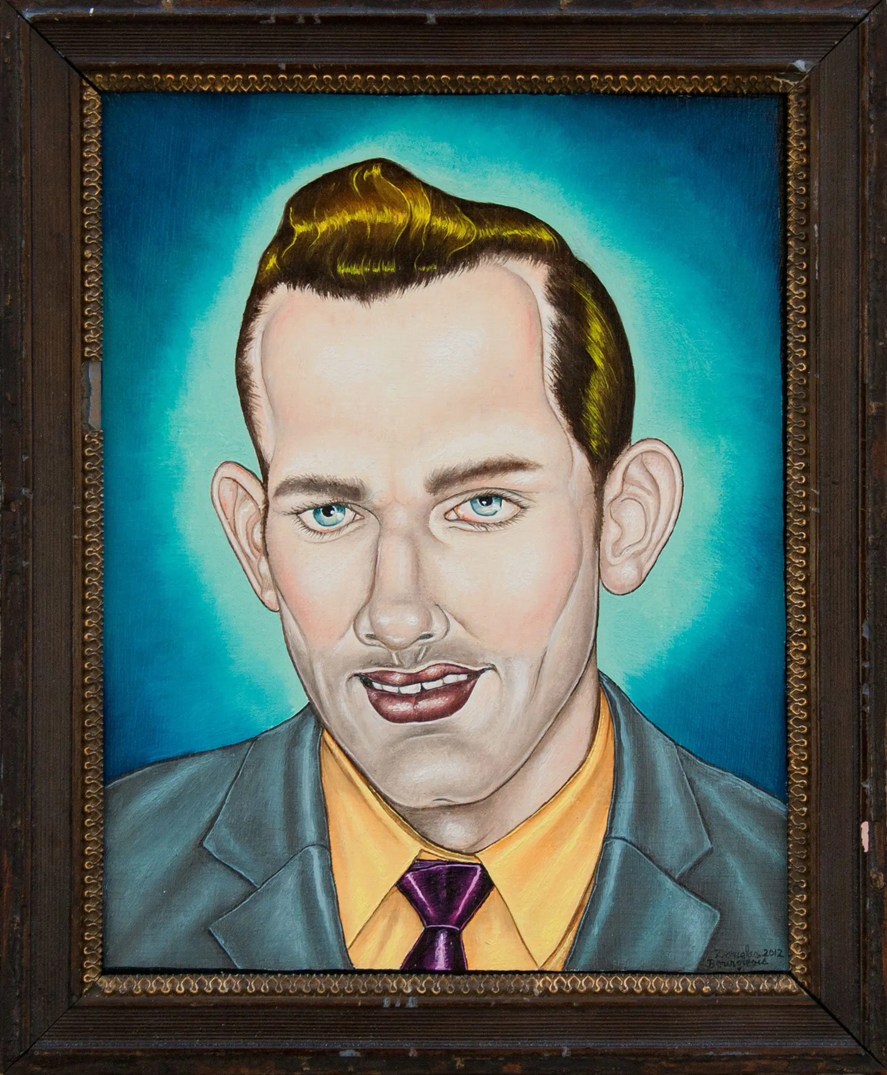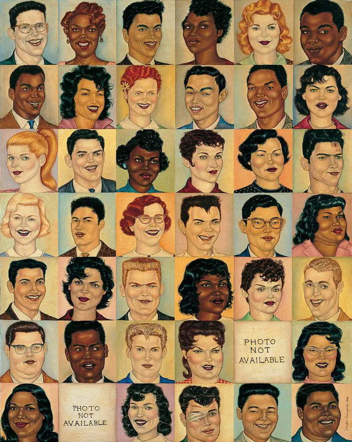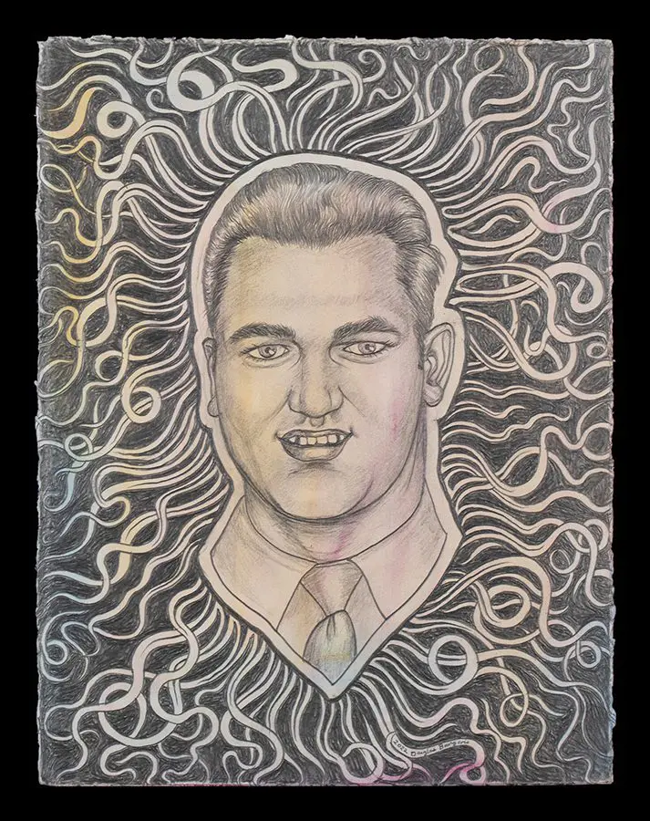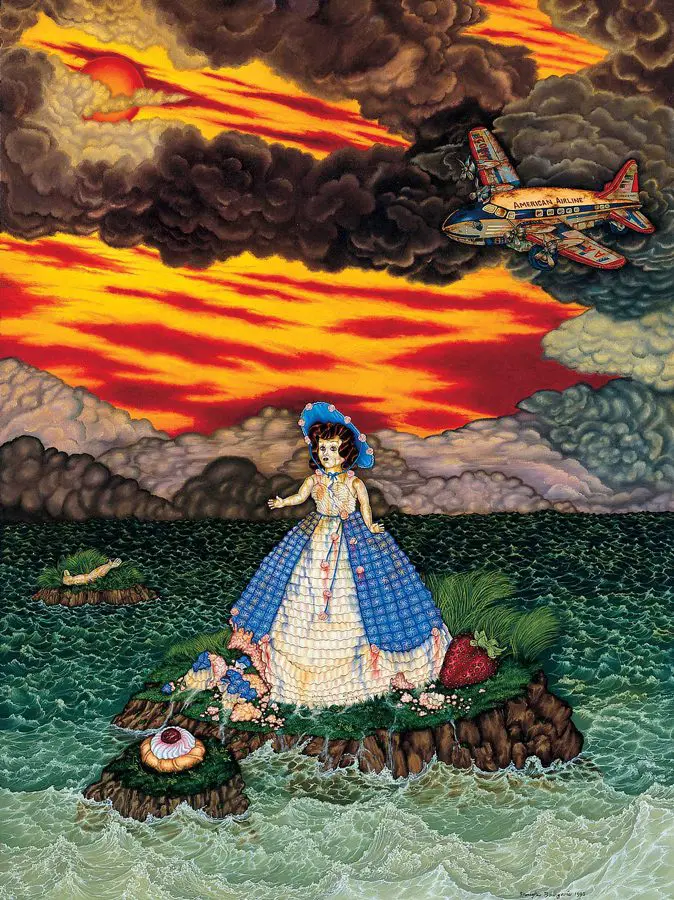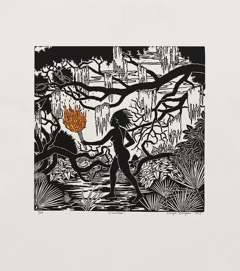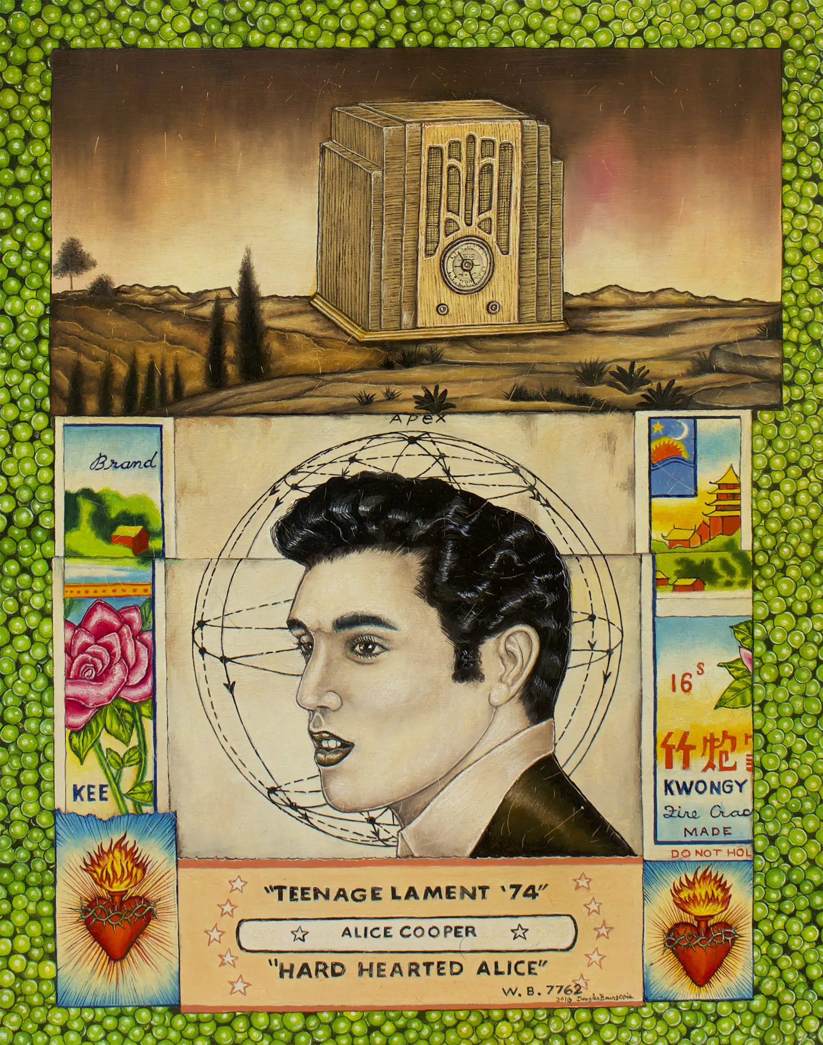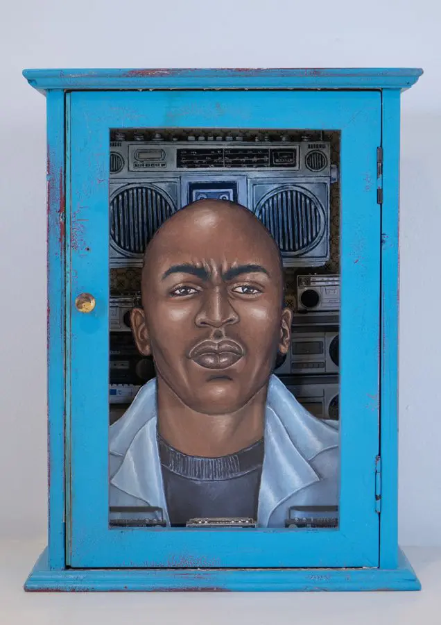 The small-scale figurative oil paintings of Douglas Bourgeois are enigmatic situations featuring one or two people in heightened landscapes or interiors. Some of the paintings are fictional portraits of unknown subjects looking at the viewer. Others are biographical fantasies, tributes to obscure recording artists. Inspirations are Deep Soul and Gospel music, primitive rock and roll, vernacular religious imagery, and discarded paper ephemera. The overwhelming natural landscape of South Louisiana, a beautiful vanishing Eden, is a primary influence. A connecting thread in the paintings and collages is the juxtaposition of the degraded and the sacred, light and darkness, the mundane and the transcendent.