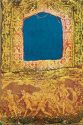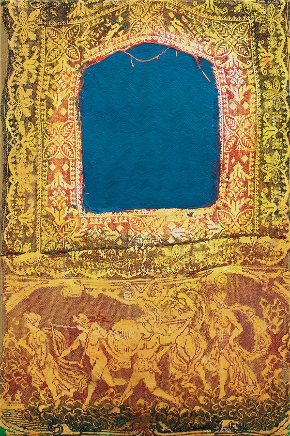 Mark Flood’s paintings are sumptuous compositions which incorporate painted images of tattered and torn lace set against backgrounds of bold saturated colors. They are torn and soiled remnants of doilies, tablecloths and curtains, yet they retain dignity and harbor storytelling potential. The filigree patterns have been destroyed by holes and rips, but the stray threads and ragged edges create other, irregular shapes that, like clouds, suddenly appear to be specific things. There is an enduring tension in Flood’s work between the rigorous patterning of the lace and the chaos of the tearing and flung threads which engages viewers emotionally.