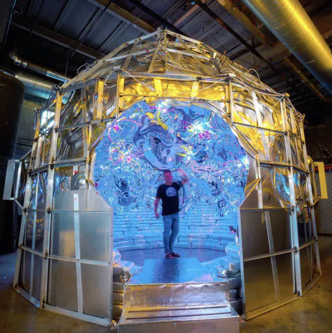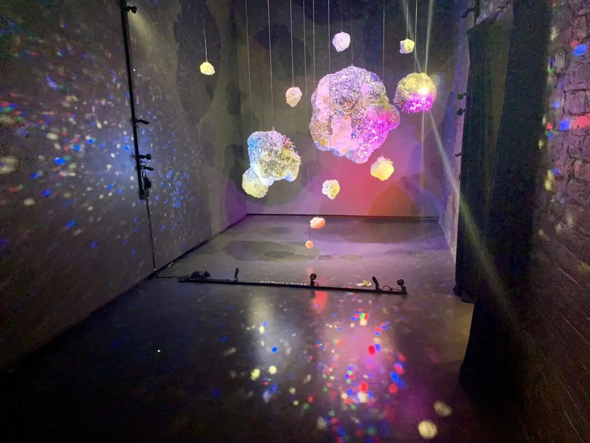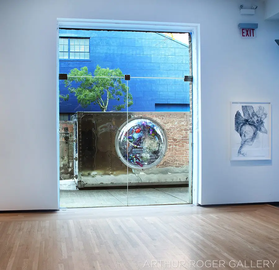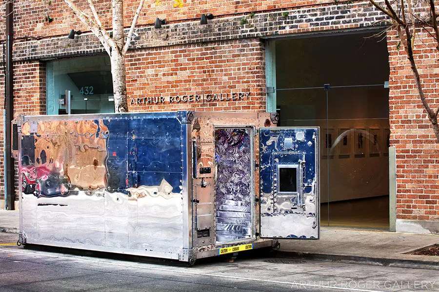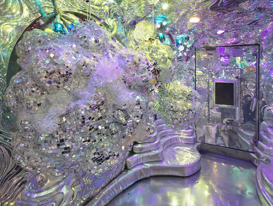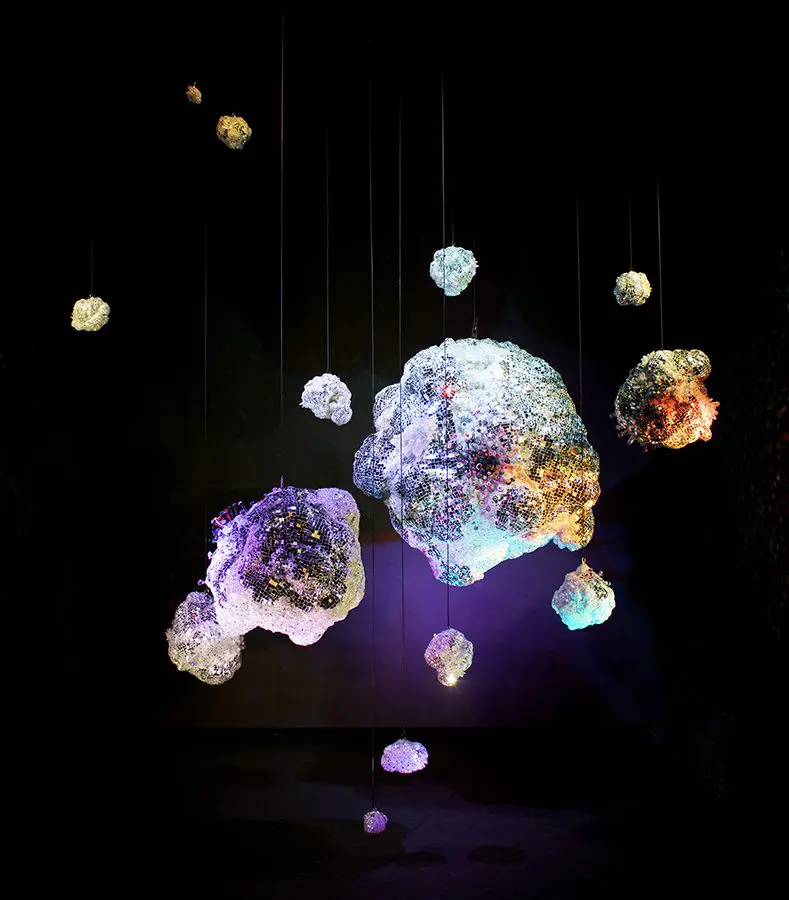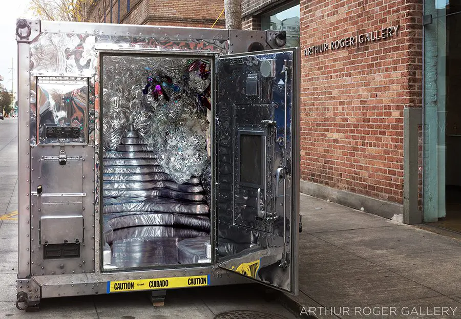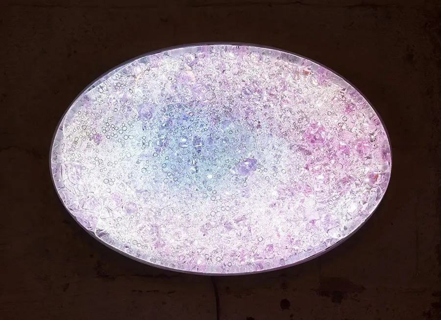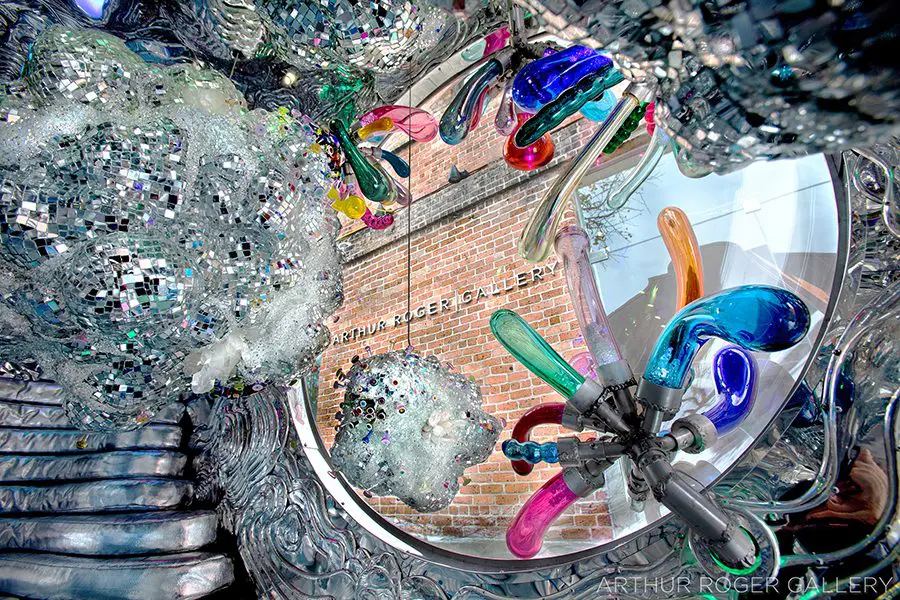 Quartz crystals, hand silvered mirror and reflective highway beads, hand blown glass elements, epoxy, steel and structural foam
