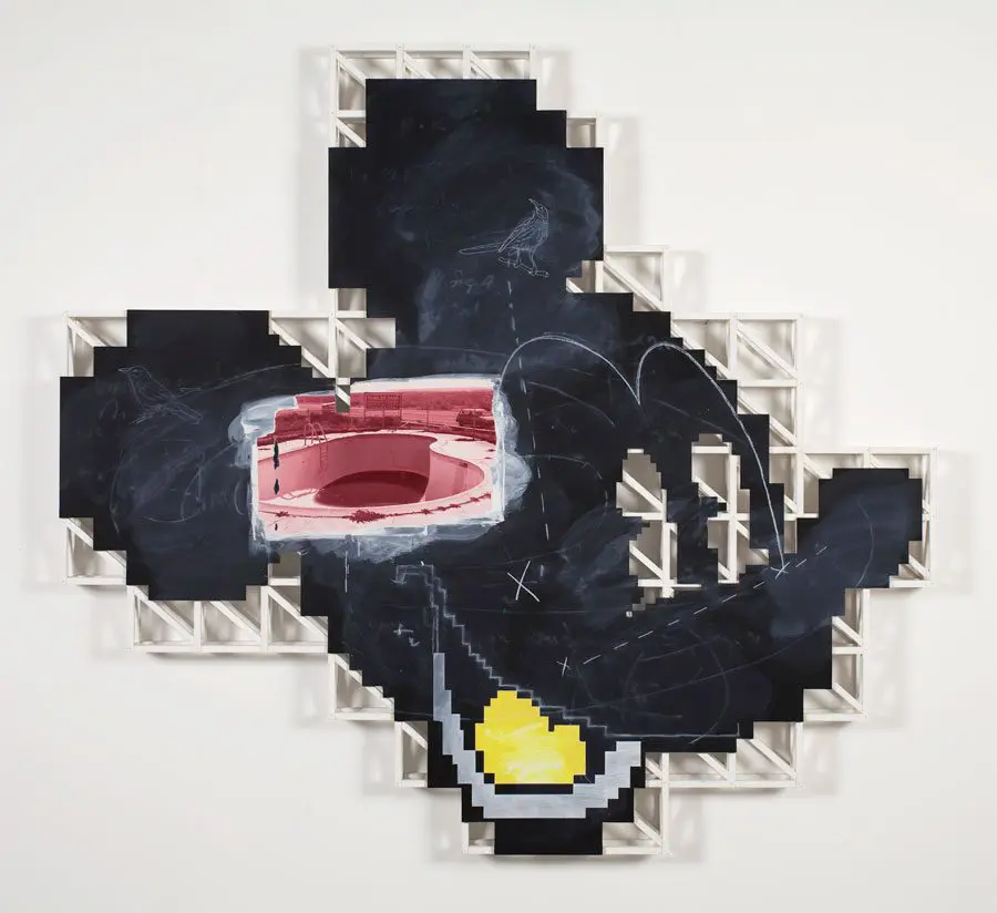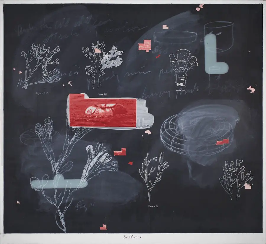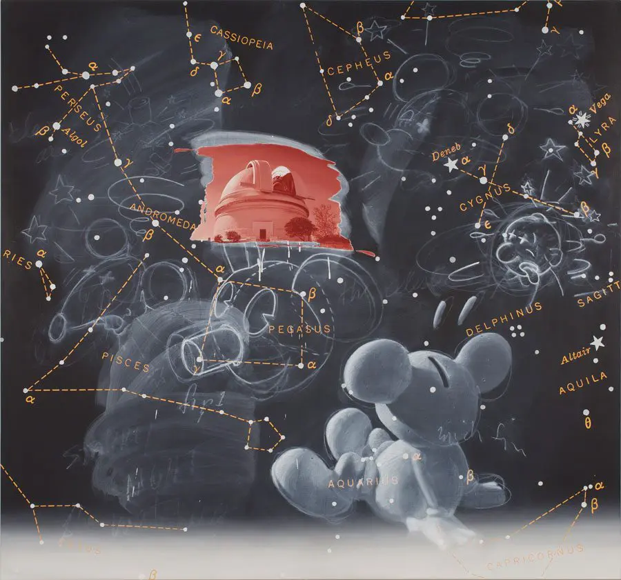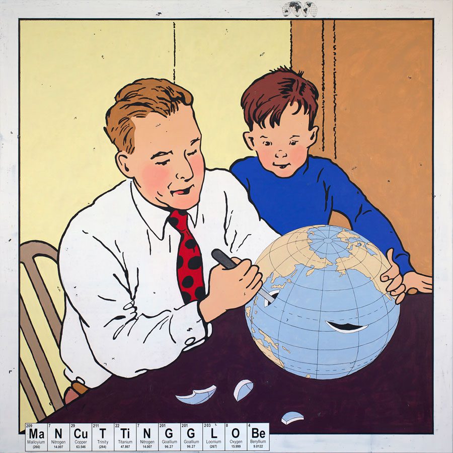 Vernon Fisher constructs meticulously-rendered visual narratives woven with literary and scientific references, as well as pop cultural imagery and iconography culled from his youth. His fascination with how people make sense of the world results in humorous, ironic, or melancholic works with often paradoxical subjects and stylistic variations. He frequently employs the effect of photography, verifiable dates of historical events and educational instruments – blackboards, maps, and globes – to establish authenticity and coalesce fact and fiction.