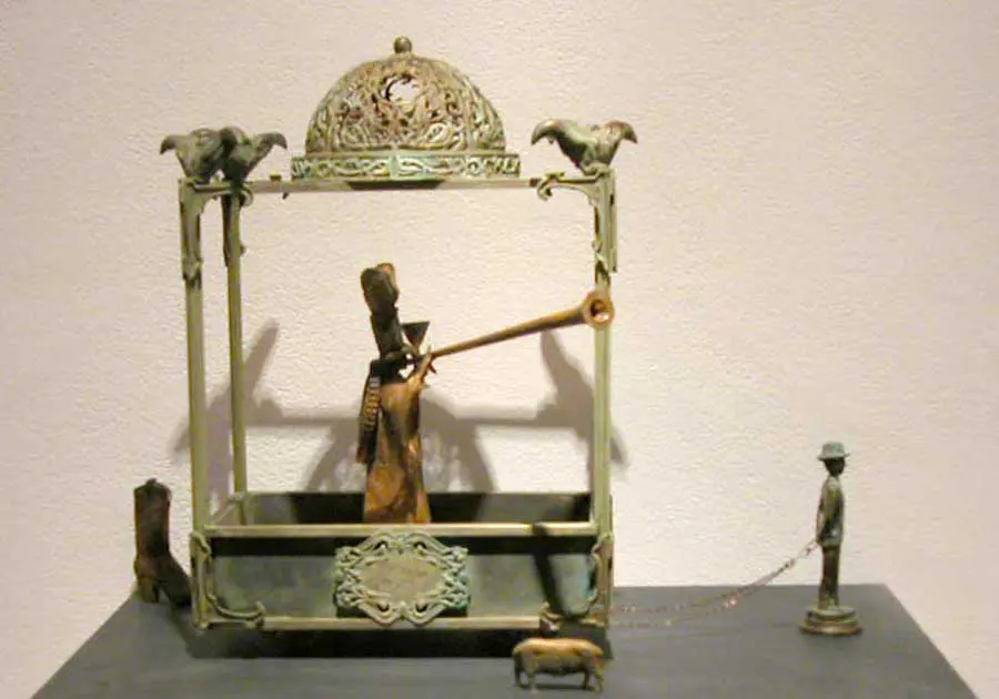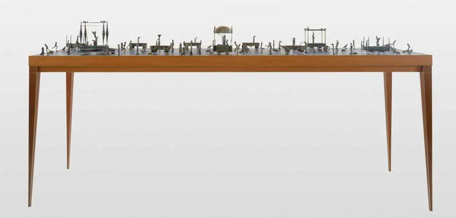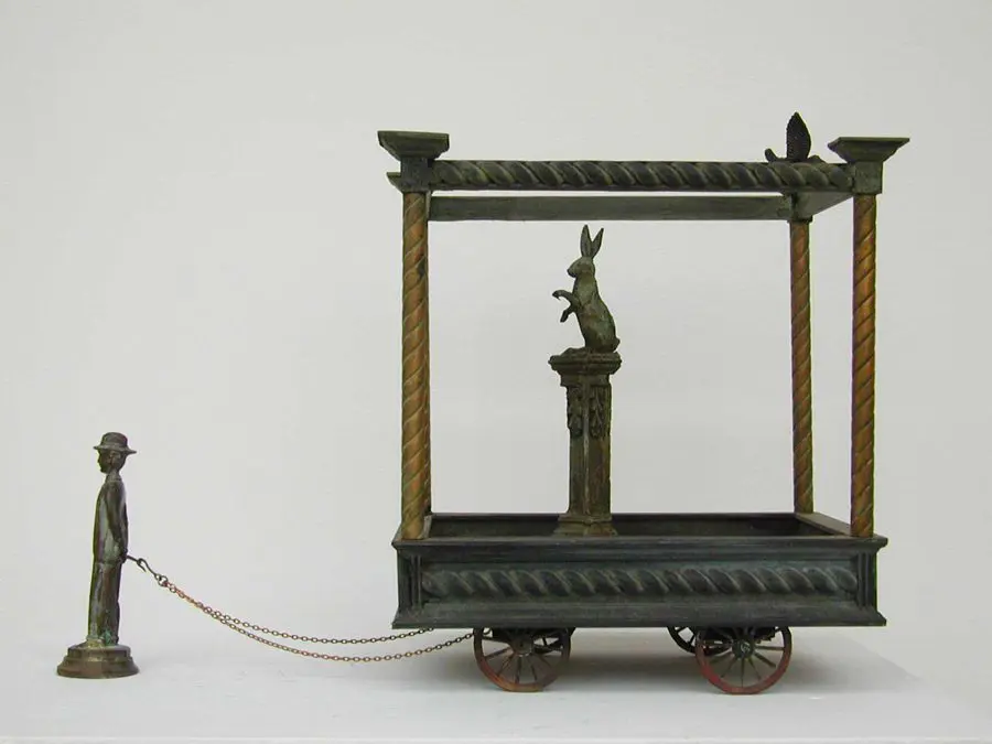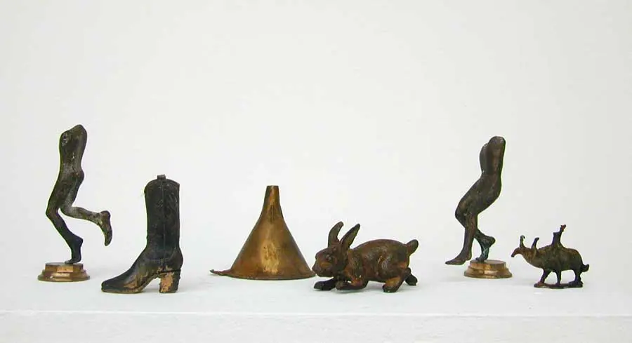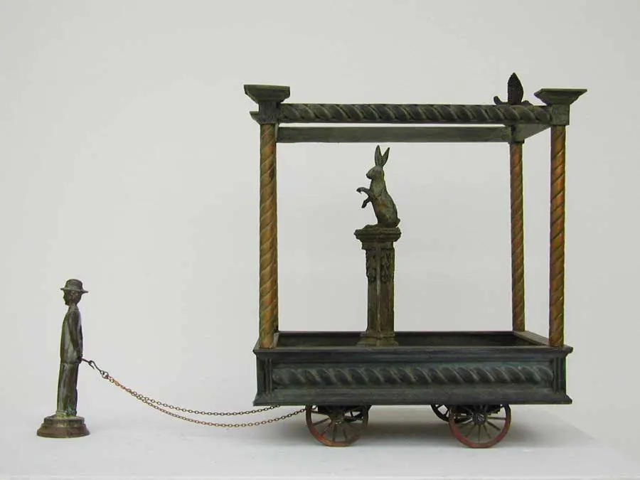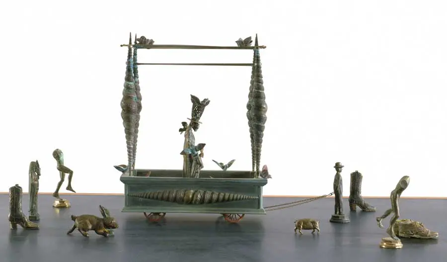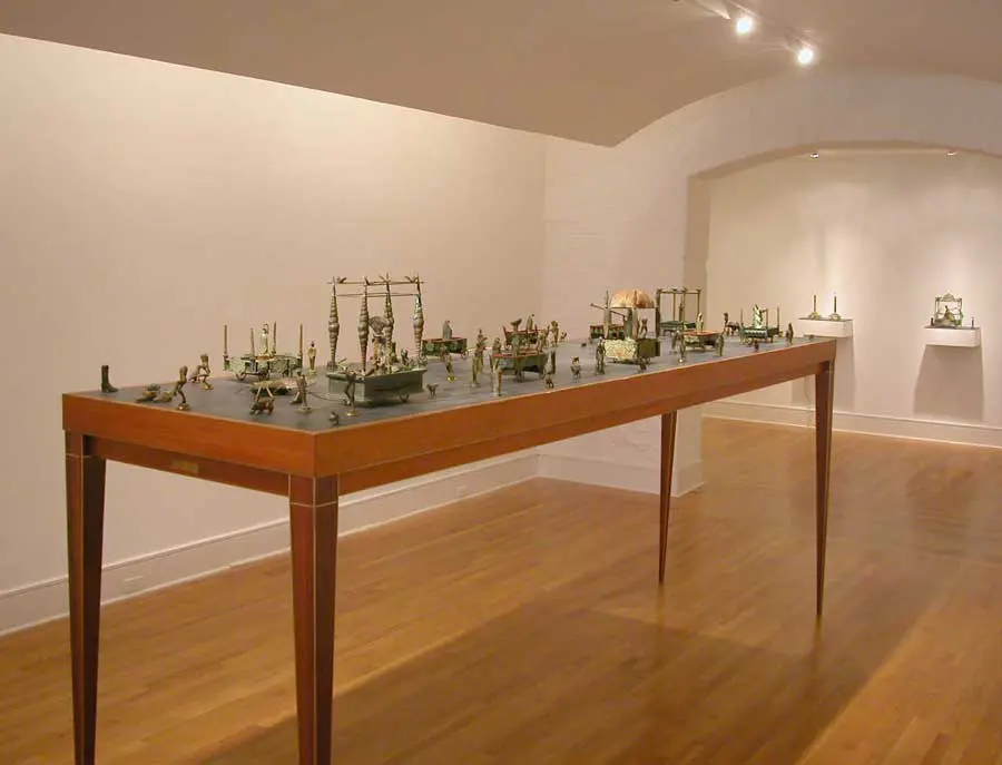 Hommage to Ste. Anne is a parade made out of bronze and wood that marches on top of a 56” x 144” x 36” mahogany table with a sandblasted plexiglass surface. The height of the piece invites the viewer to be a participant in the chaos. This installation is inspired by the artist’s experience of the Society of Ste. Anne. Every Mardi Gras morning the Society of Ste. Anne marches up Royal Street like an armada of dreams – a long line of maskers with a fantastic array of costumes, the Storyville Stompers, and dozens of fabulous hoops and streaming ribbons. It is impossible to dissect that kaleidoscope, or to convey the exuberance, the sheer delight of being, then and there, that makes the Ste. Anne parade what it is. Together with the rapture of dancing down the street to a brass band, and hundreds of amazing costumes, there is also an undertow of sadness and mortality. The march ends at the river where the ashes of fallen members are scattered with tears. The parade Ersy has created is not a representation of Ste. Anne, but an incarnation of the mystery and pleasure she discovered in Mardi Gras through her friends. Above all, it is an hommage to the great hidden genius of the Society’s guiding spirit, Paul Poche.