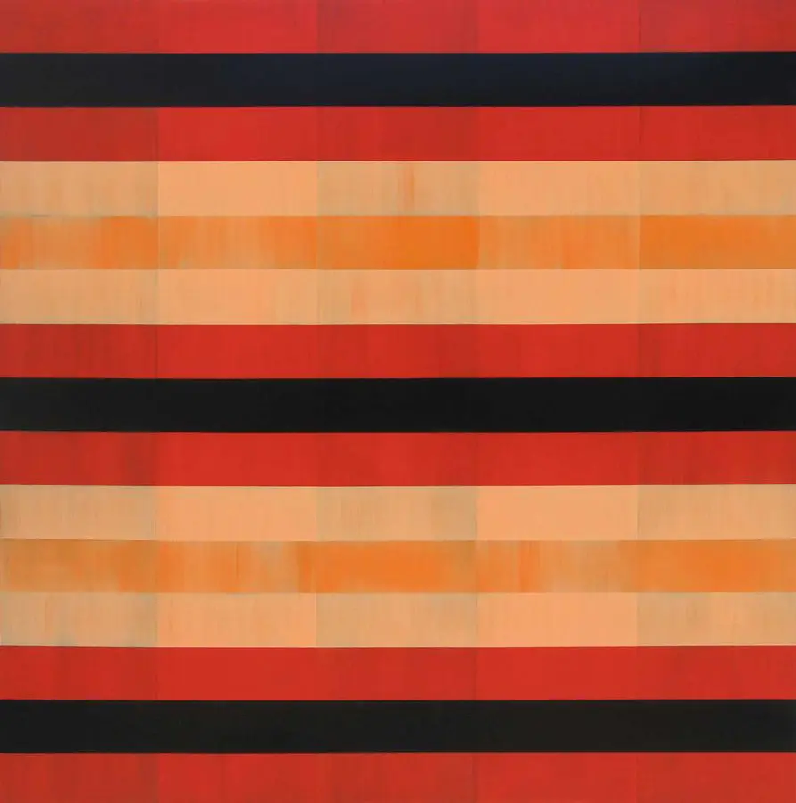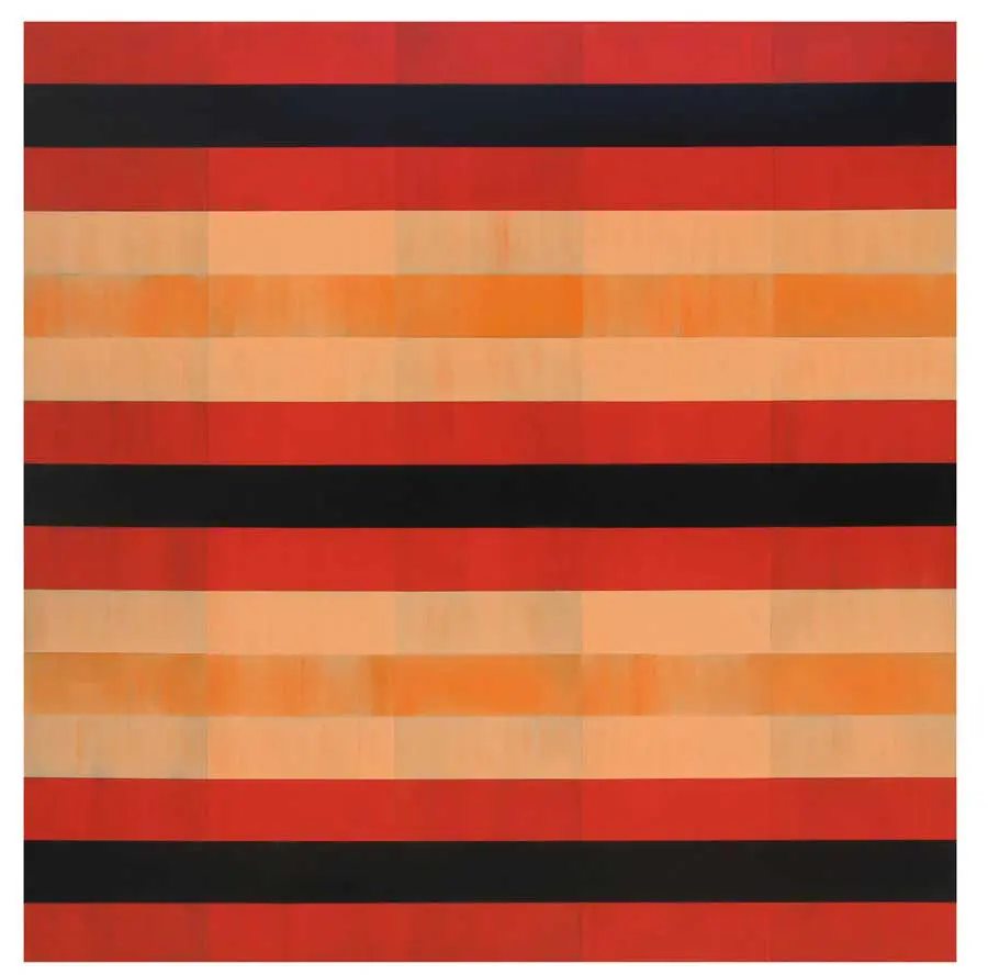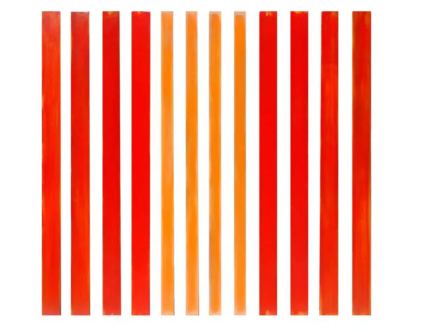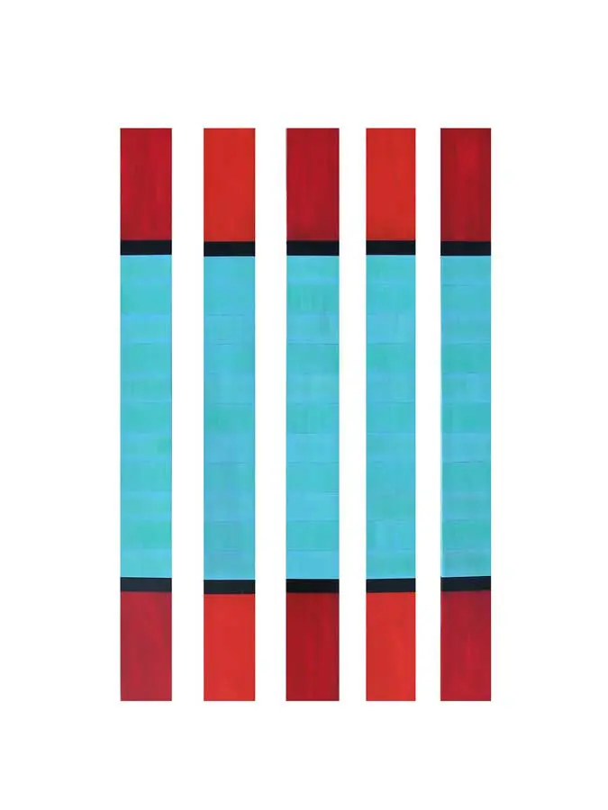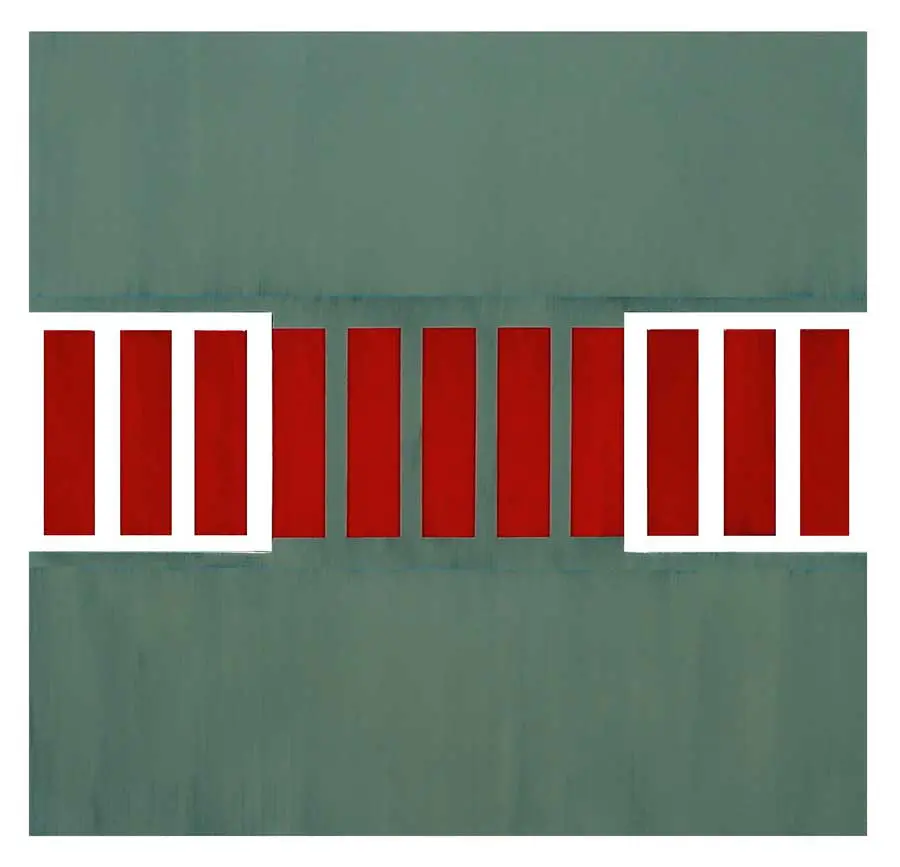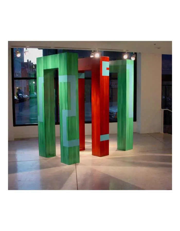 Morrison’s “Pick Up,” blends rectilinear forms and decorative grids in bold color-field works that blur the distinction between painting and sculpture. Painted in vibrant reds, blues, greens, yellows and other striking hues, the surfaces of Morrison’s work have wonderful subtlety and sensuality. His aluminum pieces are painted in a range of tones which give them an uneven painterly quality that contrasts with their bold but simple forms. Some of the works in the exhibition are multi-sectioned compositions that are made up of wall-mounted square or rectilinear forms, while others, such as Between a Memory and a Dream, made up of three tall, narrow rectangular arches placed up on end, are freestanding.