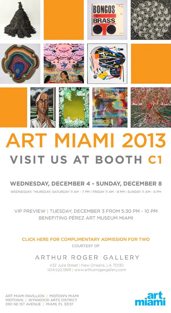 Arthur Roger Gallery is very pleased to be a part of Art Miami this year. At Booth C1, we are exhibiting works by Luis Cruz Azaceta, Richard Baker, David Bates, Jacqueline Bishop, Douglas Bourgeois, Stephen Paul Day, Lesley Dill, James Drake, Troy Dugas, George Dureau, Courtney Egan, Lin Emery, Deborah Luster, Francis X. Pavy, Holton Rower and John Waters. The exhibition will be on view from December 3 – December 8, 2013 at the Miami Art Pavilion located in the Miami Midtown Arts District.