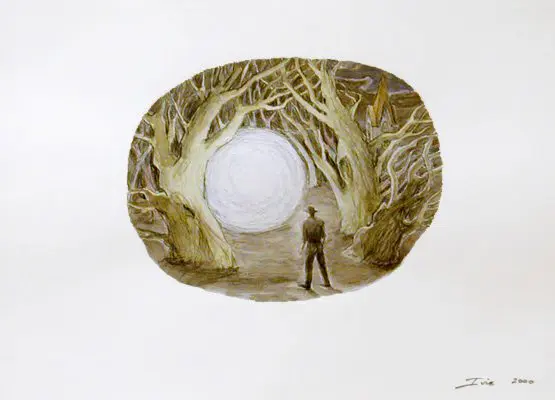The Arthur Roger Gallery is pleased to announce an exhibition of new watercolor paintings by David Ivie. In the exhibition Ivie continues his sardonic interpretation of the human psyche in a series of water color paintings that at first glance appear to be nothing more than haunting country scenes. But a closer look reveals disturbing narratives, which portray the darker side of human nature.
