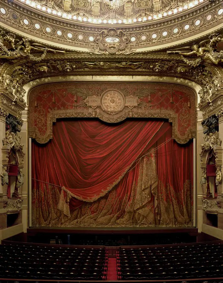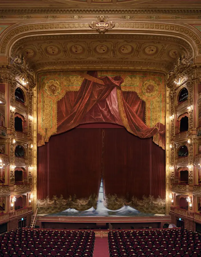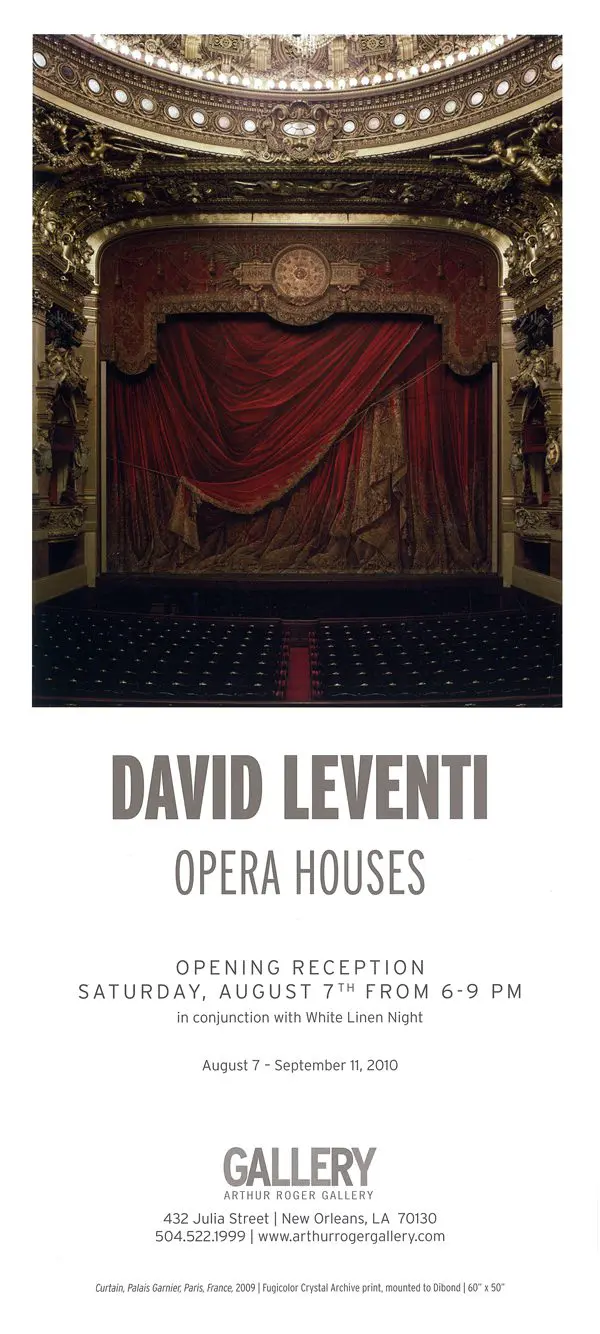 The opera houses in this body of work were specifically chosen by Leventi because they are all places his grandfather, a cantor, never had the opportunity to perform. His grandfather, who was trained by the famous Danish operatic tenor Helge Rosvaenge, often sang to Leventi when he was a child. The son of two architects, the artist says he felt a “religious feeling walking into a grand space such as an opera house.” For him the actual space can feel like the event itself and he invites his viewers to “pour over the details, to feel the potential energy in a space where it is all just about to happen.”